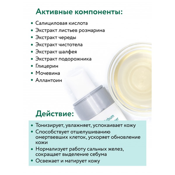 Гидролаты растений (розмарина, череды, чистотела, шалфея, подорожника) оказывают тонизирующее, противовоспалительное, успокаивающее и увлажняющее действие. Салициловая кислота способствует отшелушиванию омертвевших клеток, ускоряет выравнивание и обновление кожи. Для жирной кожи.