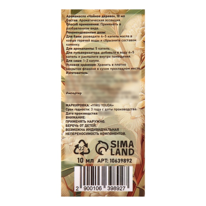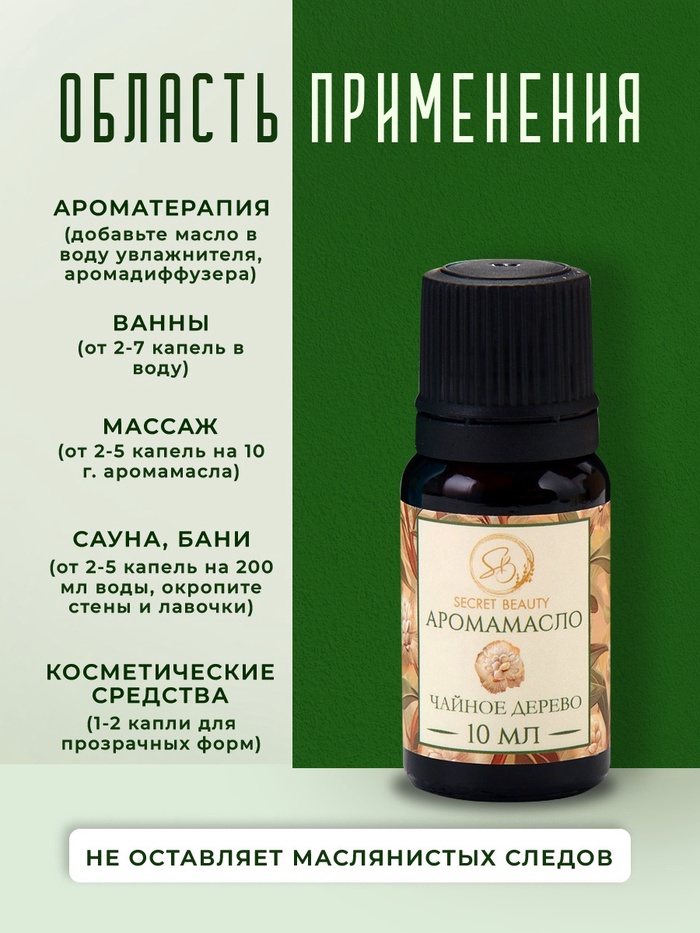 Производитель: SB BEAUTY; Габариты: 3 x 3 x 6,7; Страна: Китай; В боксе: 720 шт; Фасовка: по 1 шт; Индивидуальная упаковка: Картонная коробка; Габариты товара: 8 см × 3 см × 3 см; Сертификат: Не подлежит сертификации; Набор: Нет; Объём, мл: 10; Аромат: Чайное дерево; Фиксированная цена: Да