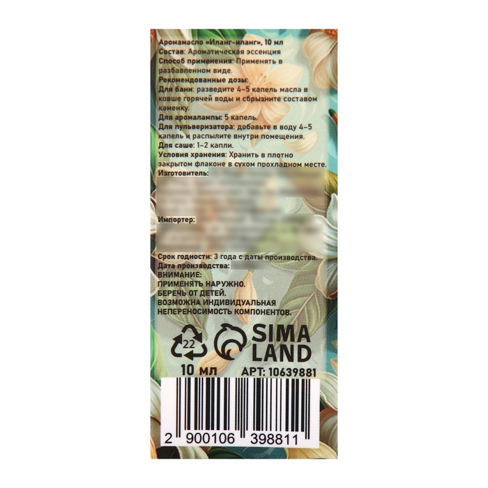 Производитель: SB BEAUTY; Габариты: 3 x 3 x 6,7; Страна: Китай; В боксе: 720 шт; Фасовка: по 1 шт; Индивидуальная упаковка: Картонная коробка; Габариты товара: 8 см × 3 см × 3 см; Сертификат: Не подлежит сертификации; Набор: Нет; Объём, мл: 10; Аромат: Иланг-иланг; Фиксированная цена: Да