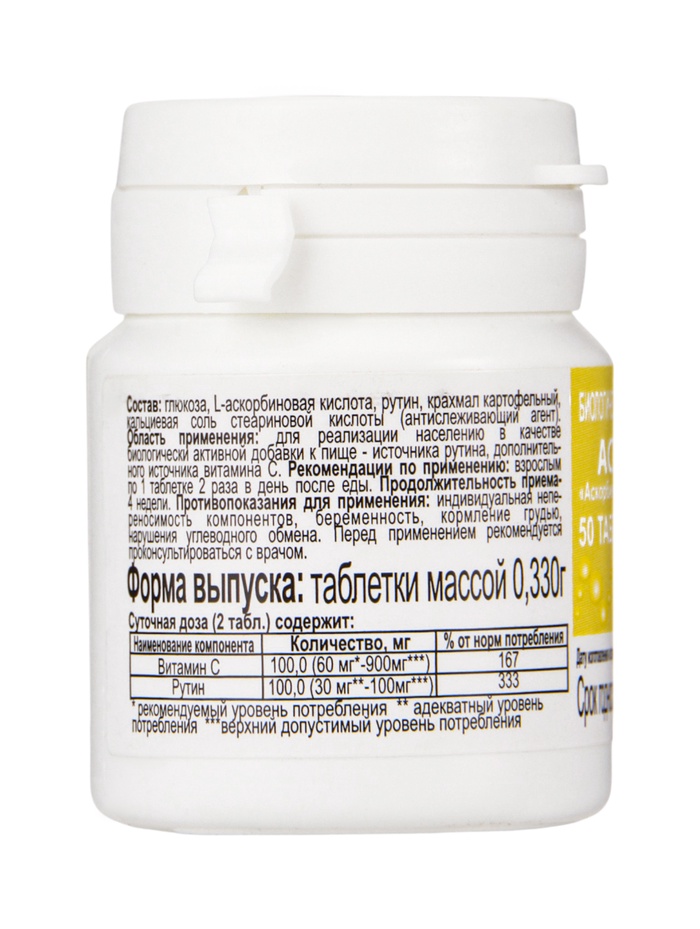 Глюкоза, L-аскорбиновая кислота, рутин, крахмал картофельный, кальциевая соль стеариновой кислоты (антислеживающий агент).