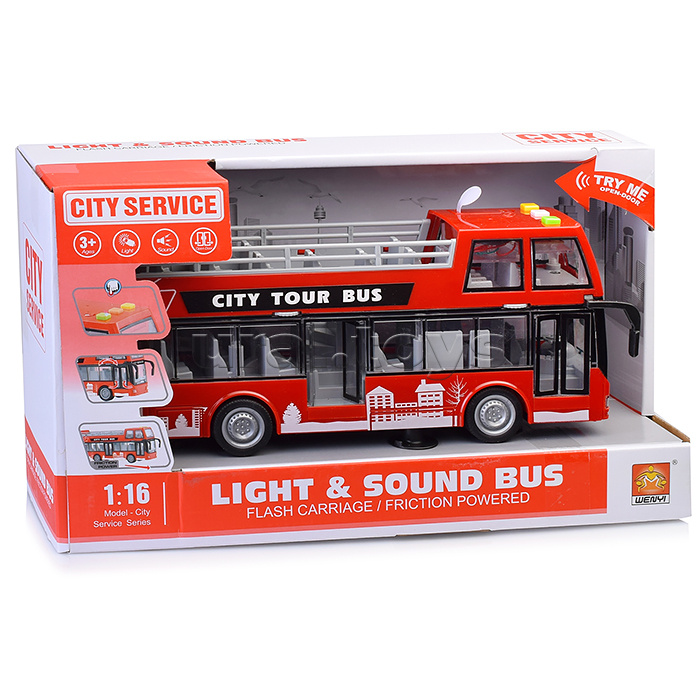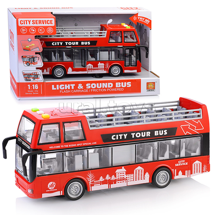 Размеры игрушки: 28х6.5х11.5 см. Инерционный механизм движения. Двери можно открывать и закрывать при помощи роликов расположенных над ними. На крыше 3 звуковые кнопки (звук мотора, гудок, задний ход, свет в кабине) Звук и свет работают от 3-х батареек "LR44" (входят в комплект для демонстрации) Материал: пластик. Соответствует требованиям безопасности продукции. Для детей от 3-х лет.