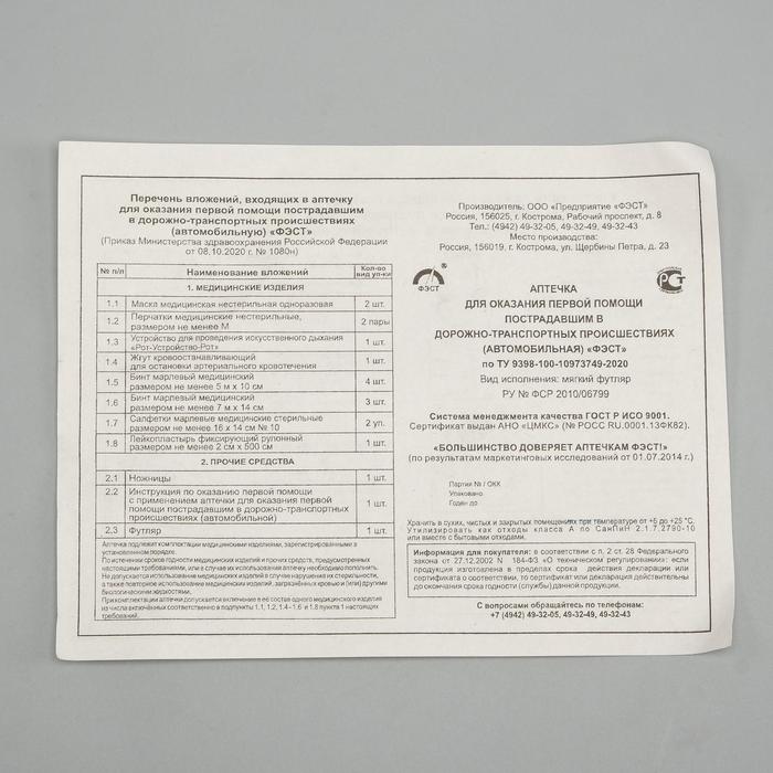 Автомобильная аптечка первой помощи «ФЭСТ», состав 2024, дорожная