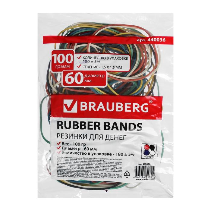 Банковские резинки BRAUBERG незаменимы во многих сферах жизни – они активно используются в банковском деле, бухгалтерии, офисах, рукоделии и быту. предназначены для фасовки и упаковки денежных купюр. Благодаря натуральному каучуку они могут свободно растягиваться в несколько раз и мгновенно возвращаются к своему первоначальному диаметру, равному 60 мм. Толщина в 1,5 мм гарантирует прочность изделия. Вес - 100 г, количество в упаковке - около 150 штук. Цвет - ассорти.