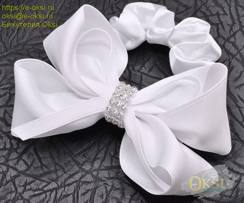Эффектная, резинка для волос из плотного шёлка, украшена бантом. Легко оборачивается в два раза, не травмируя и не повреждая волосы. Диаметр резинки 6 см, размер банта 11 см х 7 см.