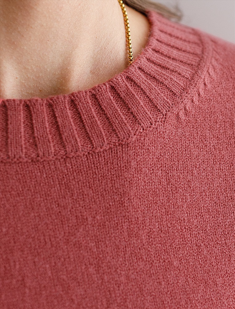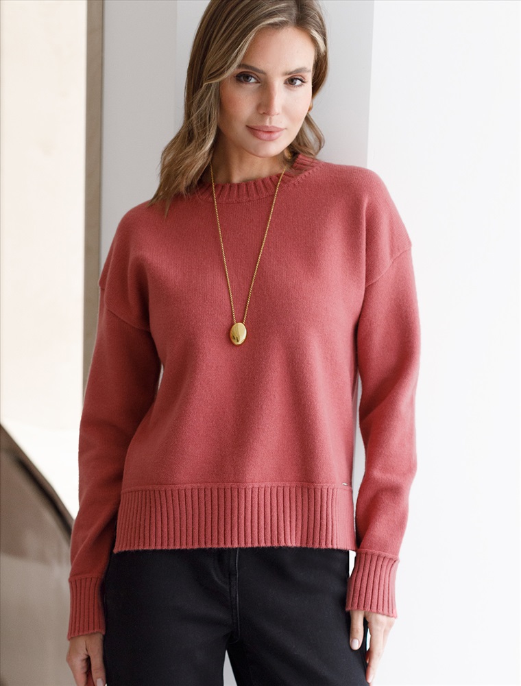 Укороченный джемпер темно-кораллового цвета с круглым вырезом связан из высококачественной пряжи с кашемиром — идеальное сочетание мягкости и практичности. Пряжа с кашемиром придаёт ему бархатистую нежность и тонкую структуру, каждое прикосновение с которой, напоминает о тепле и уюте в прохладные дни. Благодаря нежной текстуре материала этот вариант отлично подходит даже для чувствительной кожи, не вызывая раздражения и дискомфорта в течение дня. Сдержанный, элегантный силуэт джемпера подчёркивает вкуc обладательницы, а филигранная отделка ворота — внимание к деталям. Универсальный оттенок и изящная мягкость делают его идеальным выбором в любой ситуации Широкие манжеты и нижний край добавляют аккуратности, а продуманная посадка и небольшие разрезы по бокам делают повседневный джемпер удобным для многослойных образов — от офисного комплекта до расслабленного уикенда. Свободный крой джемпера идеально подходит для женщин, которые ценят удобство и стиль одновременно, а так же идеальноподходит на большие размеры. Благодаря качественной пряже свитер сохраняет форму и внешний вид даже после многократных носок.