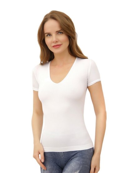 Производитель: Intimidea Оптовая продажа. Футболка женская, однотонная из микрофибры с коротким рукавом и с V-образным вырезом по горловине. Состав: Полиамид: 92% Эластан: 8%