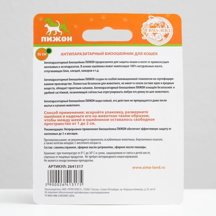 Антипаразитарный биоошейник "ПИЖОН" предназначен для защиты кошек и котят от кровососущих насекомых и эктопаразитов. В основе ошейника лежит композиция 100% натуральных масел, отпугивающих блох, клещей, комаров и т.д.
