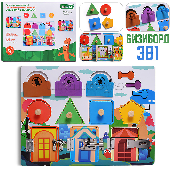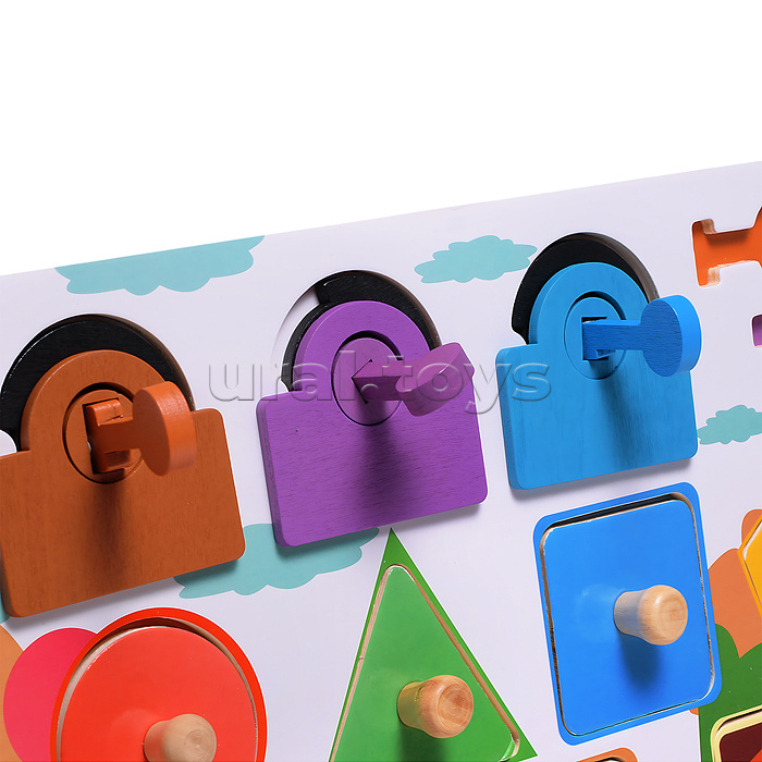 Наличие: >10 • Размеры игрушки: 30х22.5 см. • 3 замка отпрывающиеся разными ключами. • 4 вкладыша разной формы. • 3 дверцы с металлическими замками. • Материалы: дерево, металл. • Соответствует требованиям безопасности продукции. • Для детей от 3-х лет. Комментарии к товару