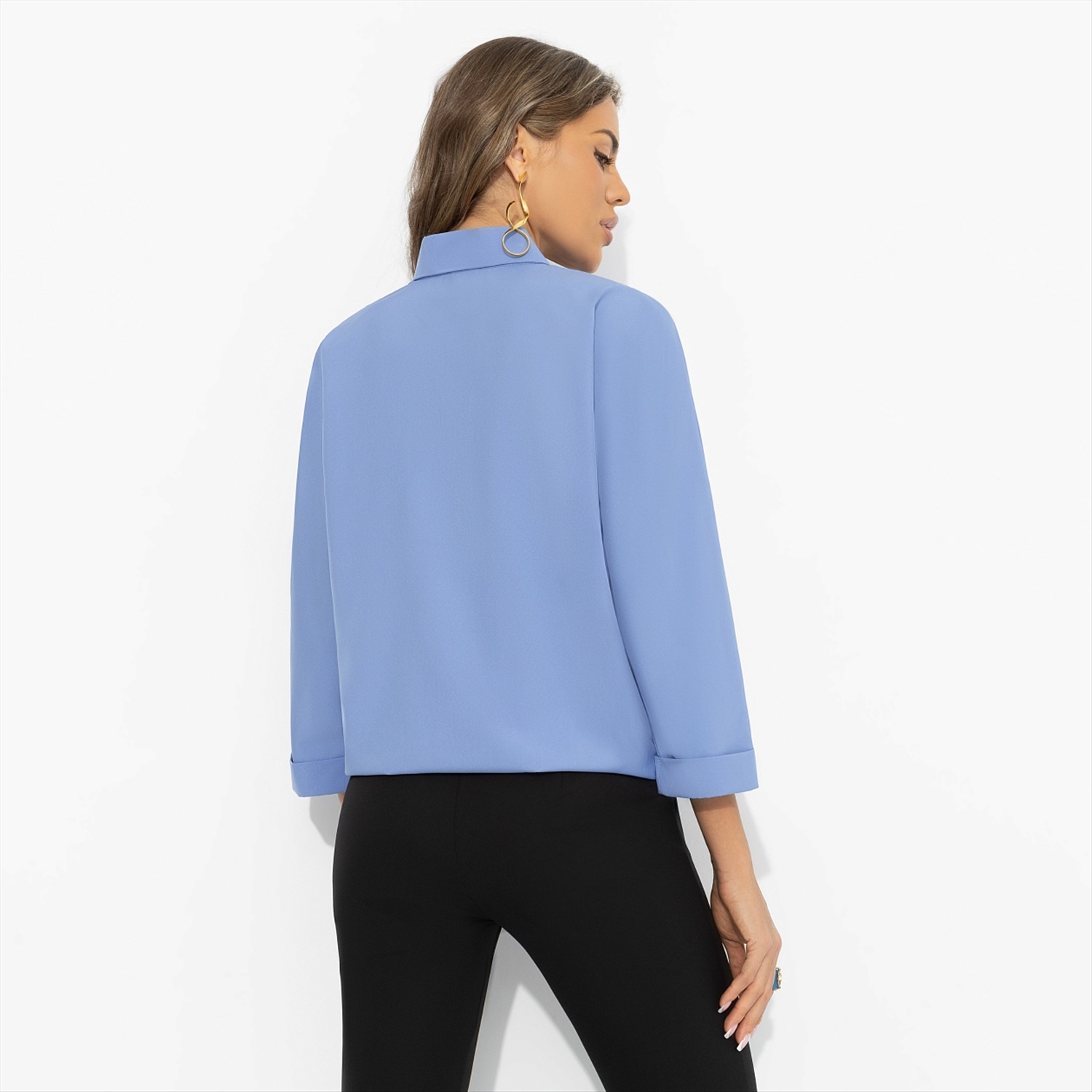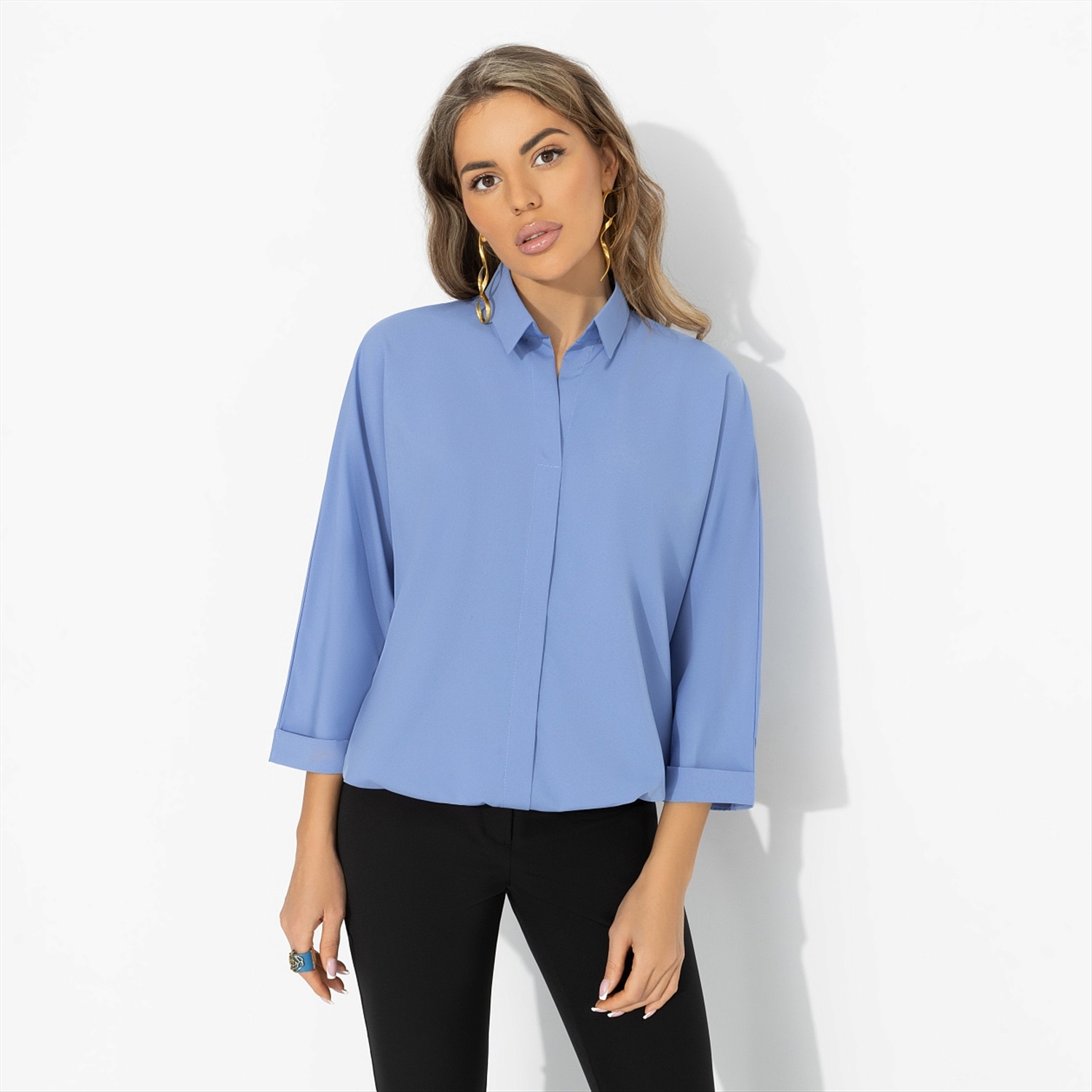 Хотите, чтобы вас слушали? Образы в оттенках голубого помогают расположить к себе – это один из самых «доверительных» цветов в визуальной коммуникации. Он дарит спокойную уверенность: когда не нужно повышать голос, чтобы быть услышанной. Достаточно просто начать говорить. Свободный крой блузы создаёт ощущение воздуха и комфорта в течение дня. Голубой оттенок освежает лицо и легко сочетается с белыми, серыми, тёмно-синими и молочными оттенками. Подходит для дней с плотным графиком и массой дел.