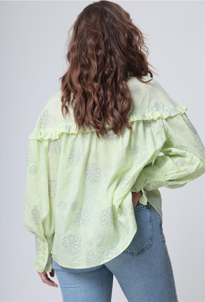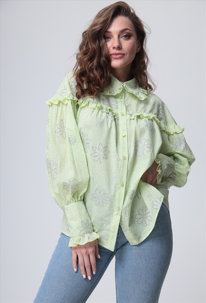 Блузка прямого силуэта. Перед блузки с отрезной плечевой кокеткой и центральной застежкой на петли и пуговицы. Спинка цельная, с отрезной плечевой кокеткой. Горловина круглой формы с воротником рубашечного типа на отрезной стойке, отлет воротника обработан рюшей. Рукав длинный, одношовный, по низу и по верху со сборкой. Низ рукава обработан притачной манжетой с застежкой на петли и пуговицы. Низ манжеты обработан рюшей. По шву стачивания переда с кокеткой, спинки с кокеткой и рукава с кокеткой обработана рюша со сборкой.