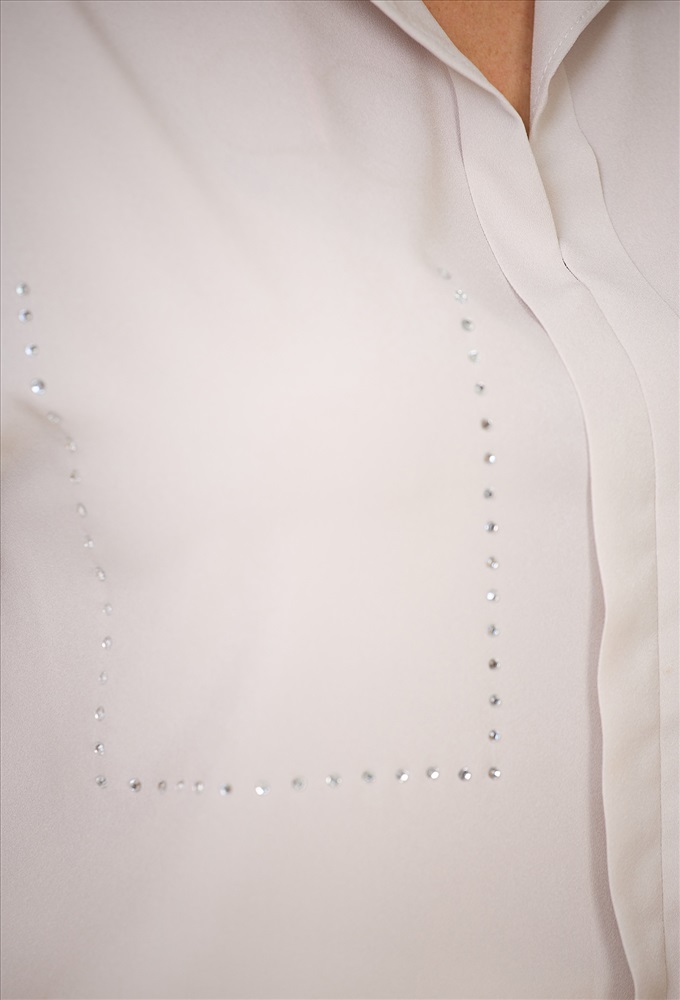 Блузка прямого силуэта, выполнена из однотонной ткани. Полочка блузки по центру со швом и складкой, иммитацией планки, переходящей в V-образный вырез с воротником на стойке, рубашечного типа. В области груди выполнен декор в виде карманов выложенных из страз. Спинка цельная. Рукав одношовный, рубашечного типа, пройма углубленной формы. По низу рукав со складками обработан притачной манжетой с застежкой на петли и пуговицы.