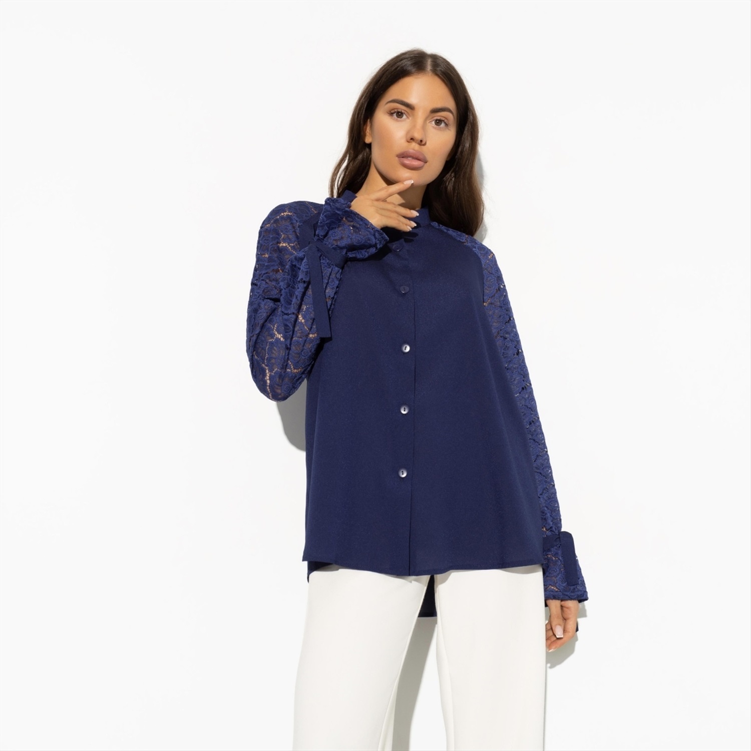 Глубина – то, что мы ищем в отношениях с миром. Погрузиться с головой, ощутить всю полноту чувств... Глубокий синий – цвет для тех, кто ценит фундаментальность жизни. Блуза свободного кроя. Идеальна для любого типа фигуры. Рукава из прозрачного кружева оформлены завязками. Легкая ткань обеспечивает струящиеся силуэт.