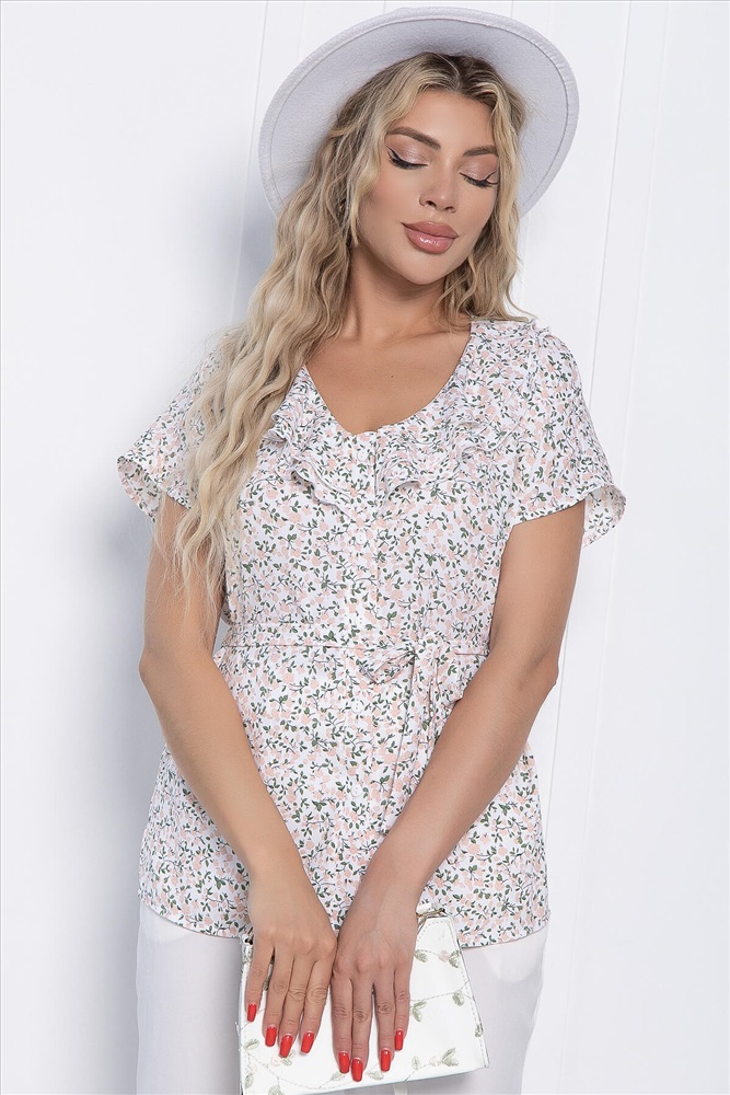 Очаровательная блузка с V-образным вырезом и воланами! Цветочный принт добавит романтичности, а пояс из основной ткани, который входит в комплект, поможет подчеркнуть достоинства фигуры и скрыть её недостатки. Эта элегантная модель блузки идеально подойдёт для вечеринки, театра или ресторана, а также может быть использована в качестве офисной одежды.