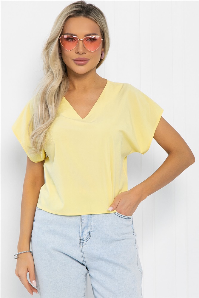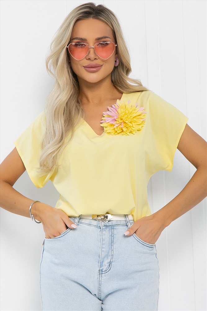 Блузка лимонного оттенка, украшенная брошью в виде цветка, — это идеальное решение для тех, кто стремится выглядеть женственно и уникально! Удлинённая линия плеча создаёт элегантный силуэт, а V-образный вырез придаёт образу стильный акцент. Эта блузка отлично сочетается как с юбками, так и с брюками, позволяя создавать разнообразные стильные образы для любого случая!