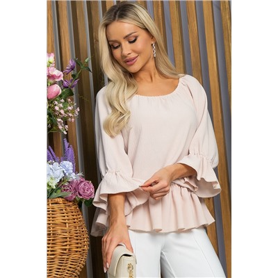 Однотонная бежевая блуза — это прекрасная основа для создания разнообразных образов. Рукав три четверти, по низу украшен воланом. Само изделие также украшено по низу воланом, что придает образу легкости и воздушности. Горловина отработана резинкой, это позволяет спустить блузу на плечи, что придаст образу кокетства. Отлично будет смотреться как с брюками, так и с джинсами.