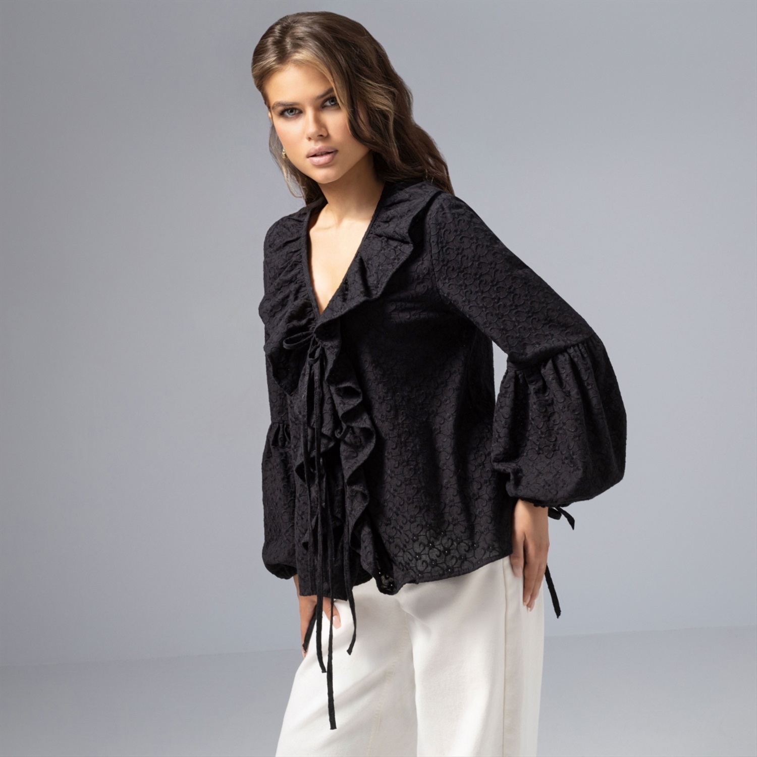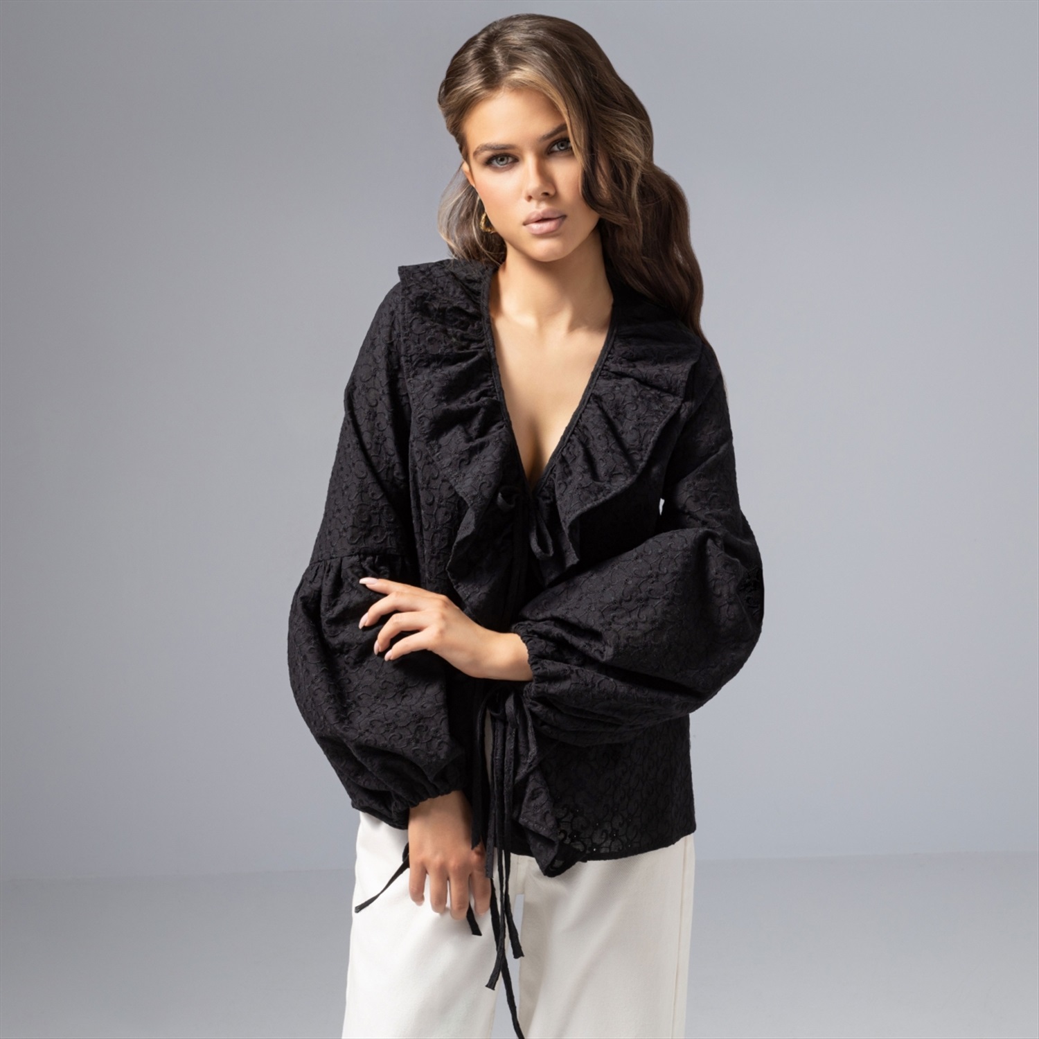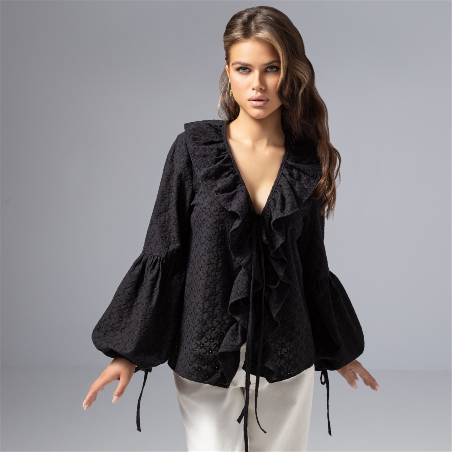 ТН ВЭД: 6206300000; Состав: Поплин вышивка (100% хлопок); Плотность ткани: Тонкая; Тип ткани: Текстиль; Вид застежки: Завязки; Декоративные элементы: Рюши; Карманы: Нет; Основной цвет ткани: Черный; Отрезная талия: Нет; Подклад: Нет; Резинка по талии: Нет; Рисунок/раппорт: Нет, все изделия идентичны; Сезон: Круглогодичный; Силуэт: Свободный