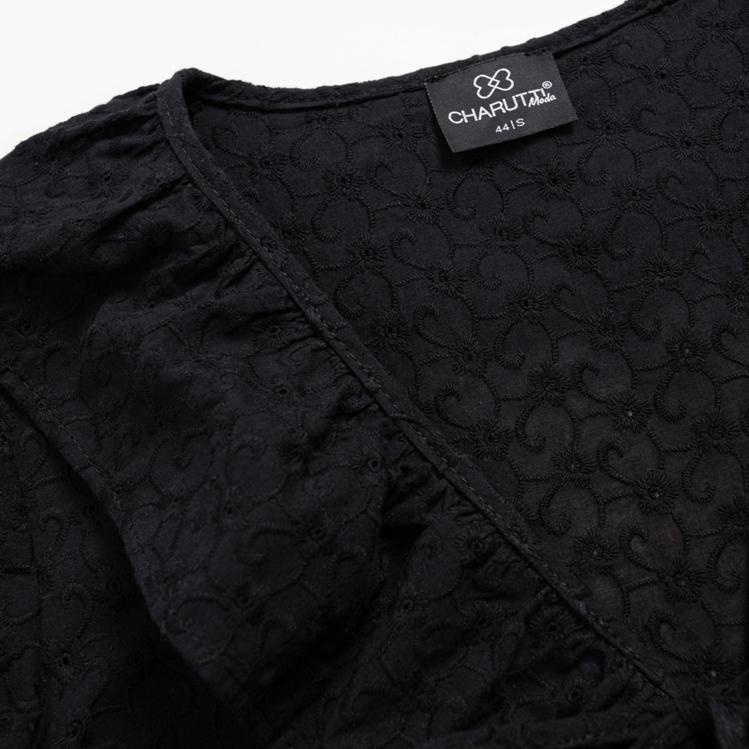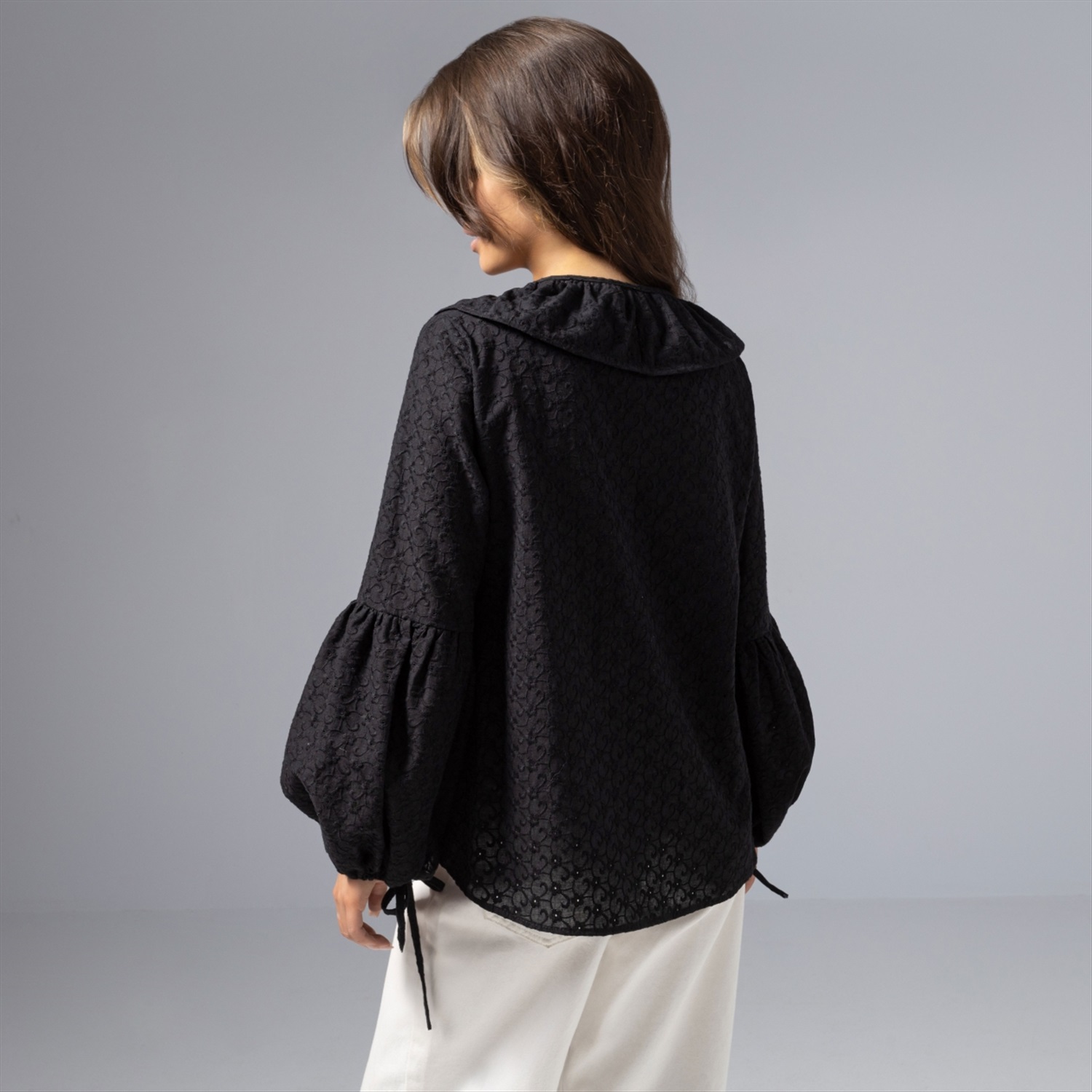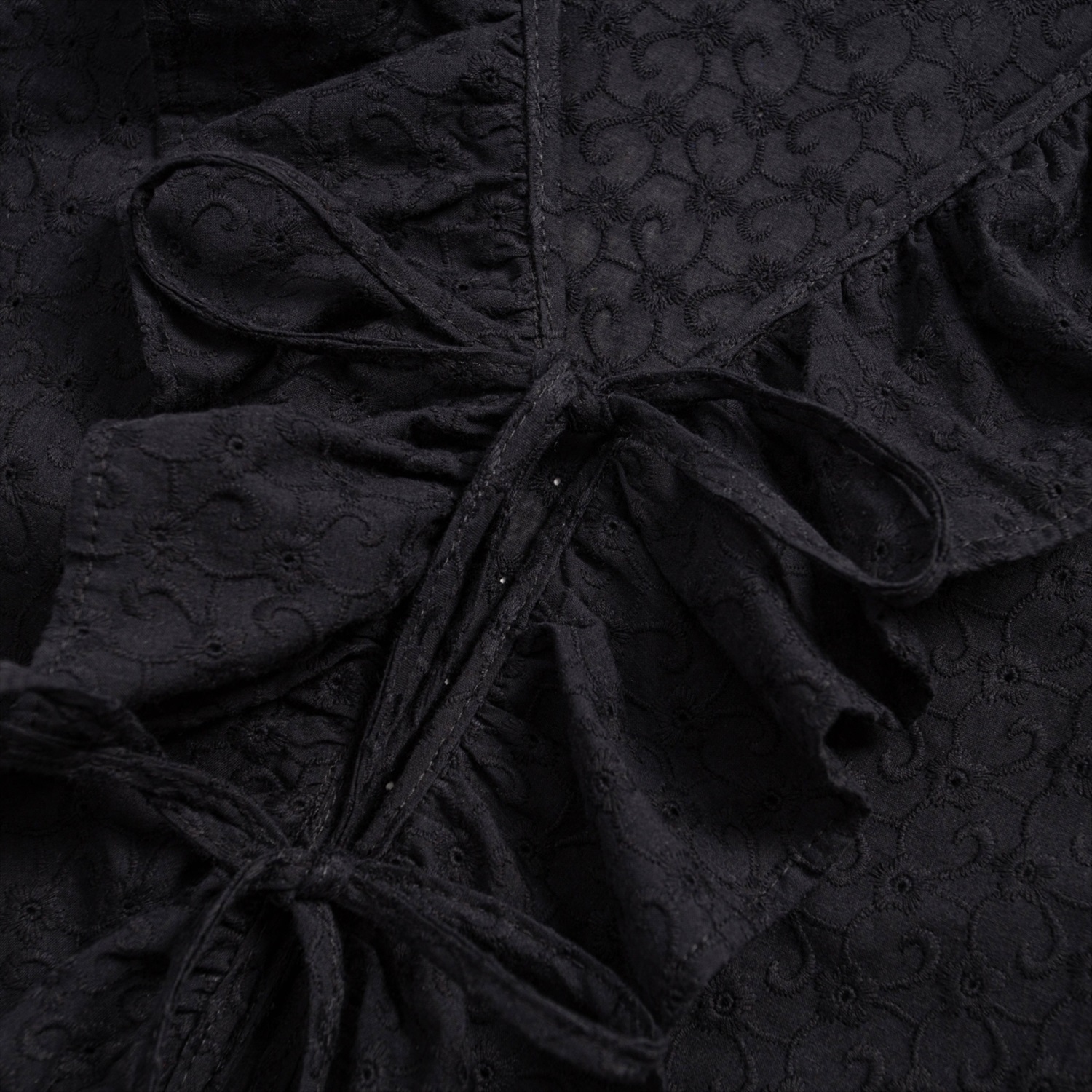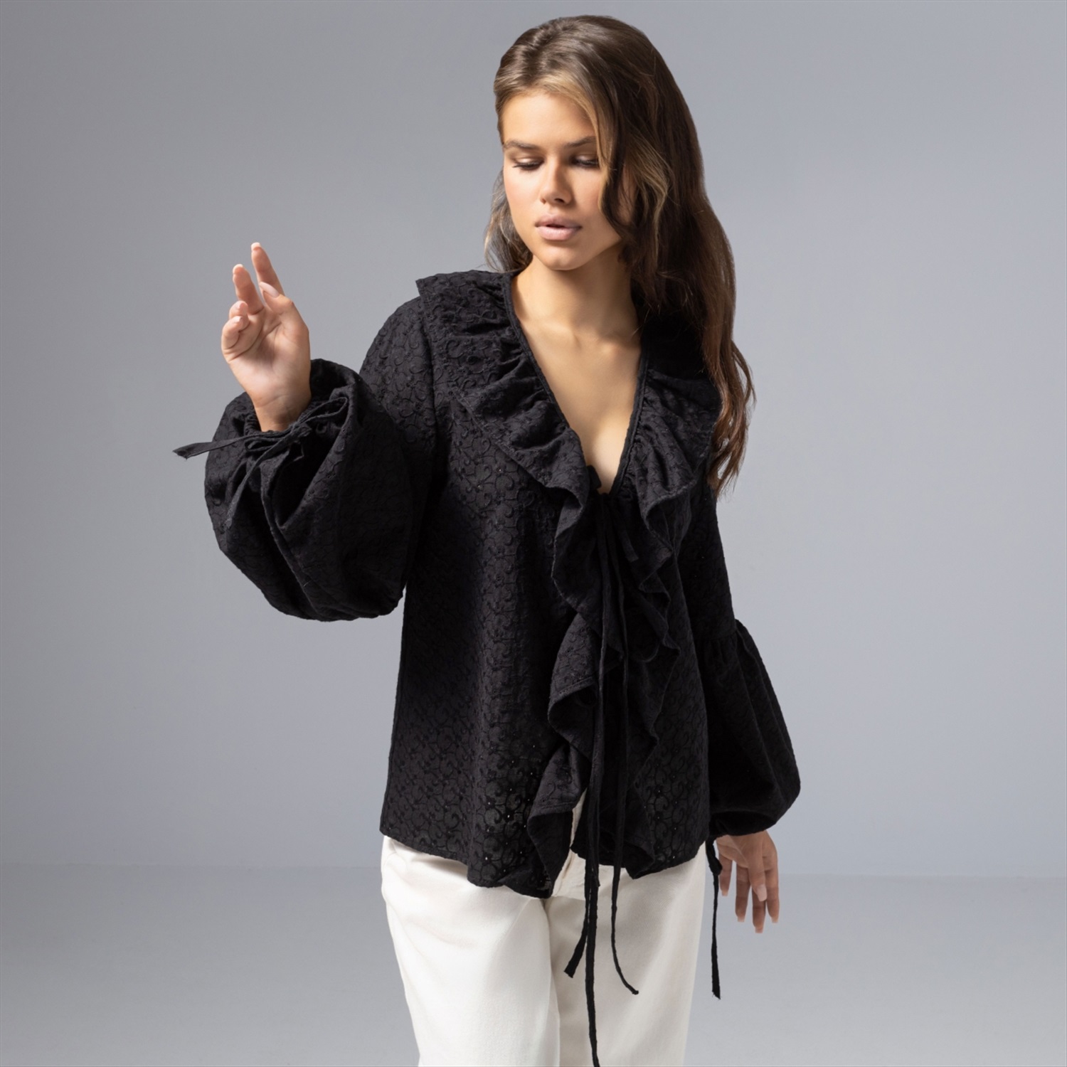 ТН ВЭД: 6206300000; Состав: Поплин вышивка (100% хлопок); Плотность ткани: Тонкая; Тип ткани: Текстиль; Вид застежки: Завязки; Декоративные элементы: Рюши; Карманы: Нет; Основной цвет ткани: Черный; Отрезная талия: Нет; Подклад: Нет; Резинка по талии: Нет; Рисунок/раппорт: Нет, все изделия идентичны; Сезон: Круглогодичный; Силуэт: Свободный