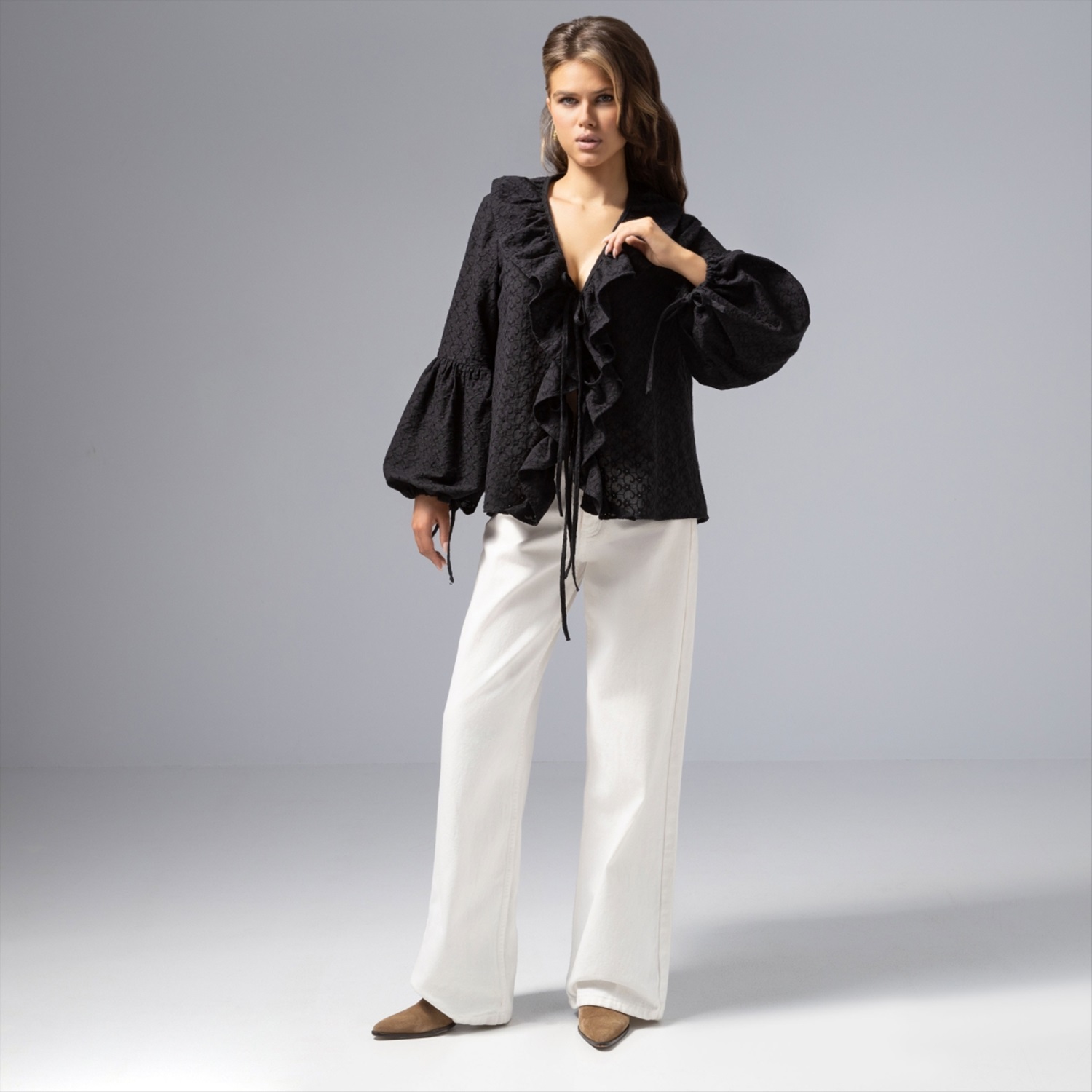 Тренд сезона – завязки, как у Ganni, плюс щедрая порция рюш и объемные рукава. Не просто блуза, а приглашение к кокетству: немного богемы, немного французской легкости, и максимум женственности. 100% хлопок, вышитый поплин с фактурным узором, рюши по краю и трендовые завязки на груди и рукавах. Свободный крой с акцентом на декольте – идеально для тех, кто ценит стиль, который точно сработает.