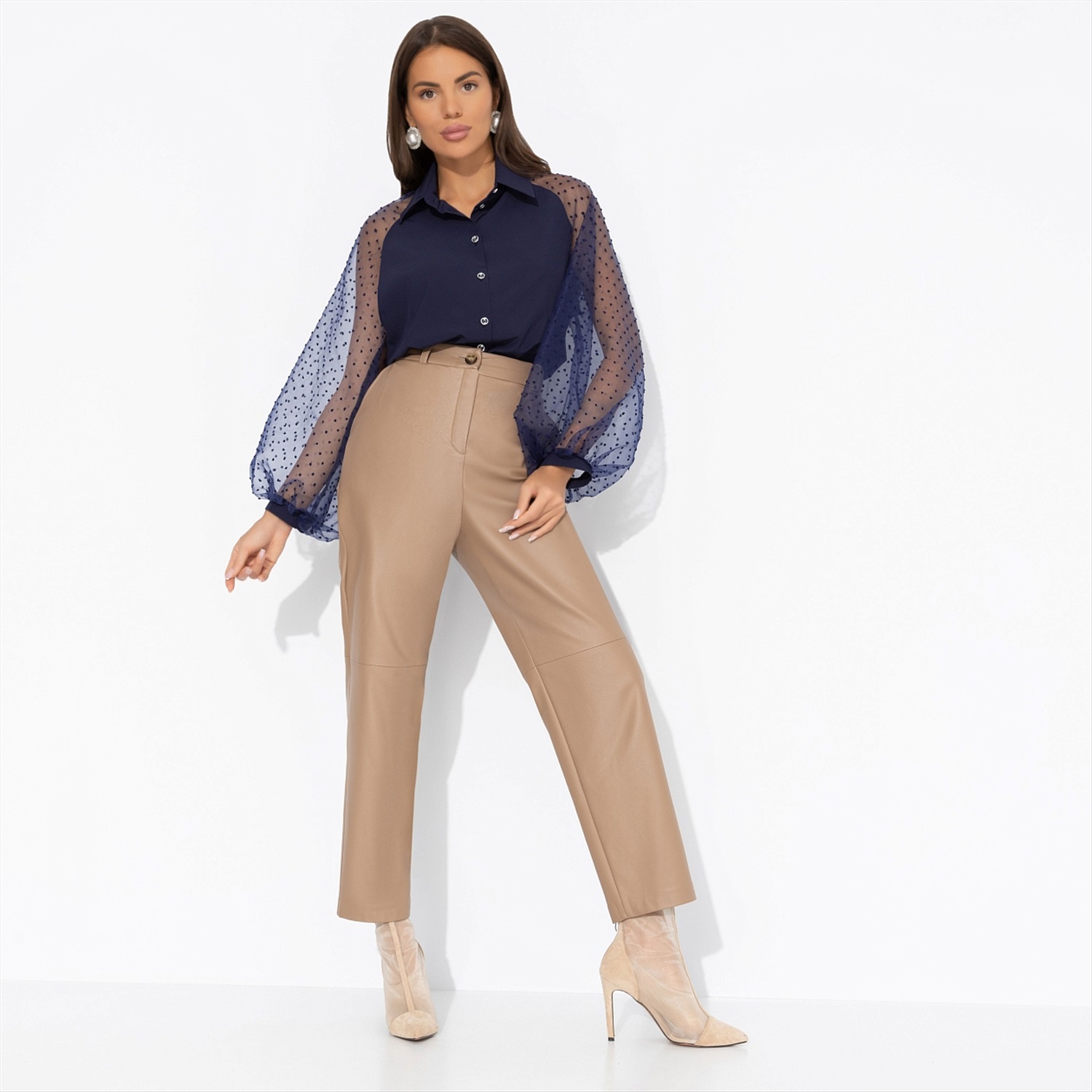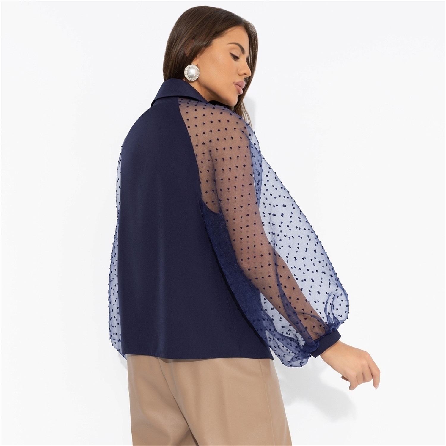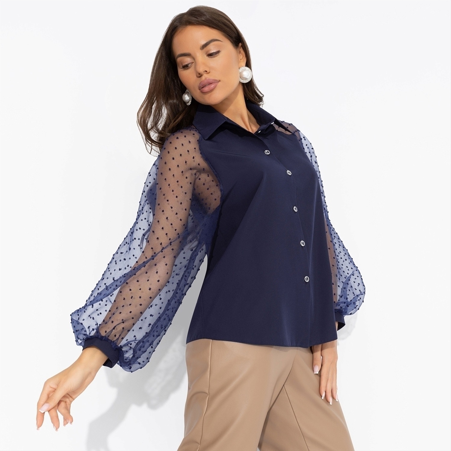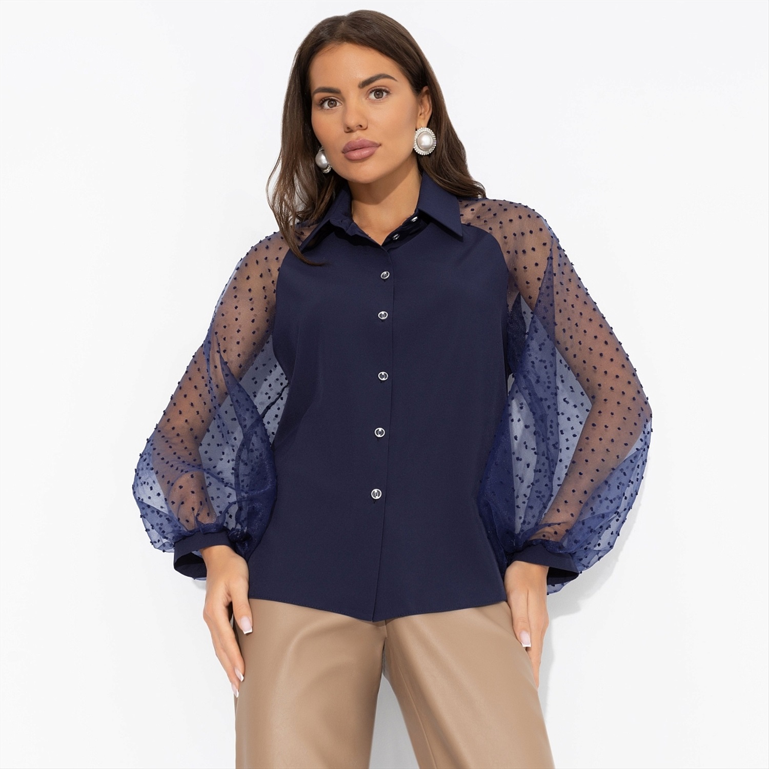 Горошек блузы ЧАРУТТИ будто сошел с бабушкиного праздничного сервиза. Блюдца и чашки, которые хранились и оберегались целыми поколениями. Ты взяла на себя смелость пить жизнь большими глотками из самой нарядной посуды. Внучки будут гордиться. Блуза классического силуэта с объемными рукавами. Рукава прозрачные из сетчатой ткани. Изделие застегивается на пуговицы. Блуза хорошо смотрится в заправленном виде и навыпуск.