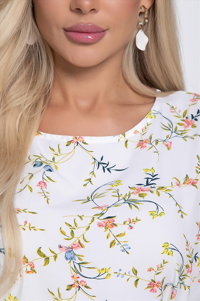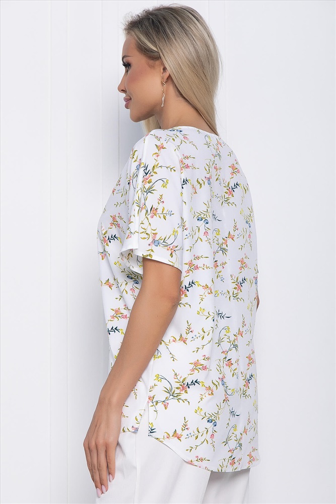 Блузка с цветочным принтом станет отличным дополнением в вашем гардеробе! Её легко сочетать с брюками, джинсами или юбкой. Также можно надеть под пиджак или жакет. Модель свободного кроя с цельнокроеным рукавом и округлым вырезом. Она подходит для повседневных образов и для домашнего использования. Благодаря своему свободному крою она обеспечит комфорт и свободу движения. По бокам разрезы. Передняя часть короче задней.