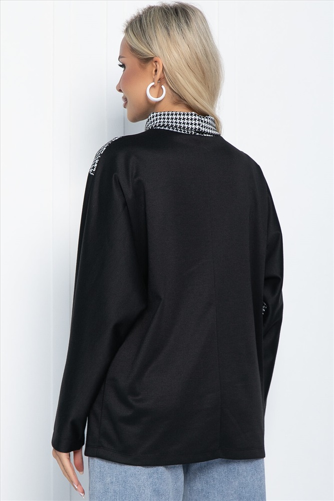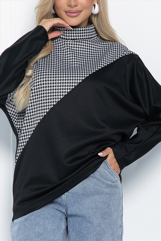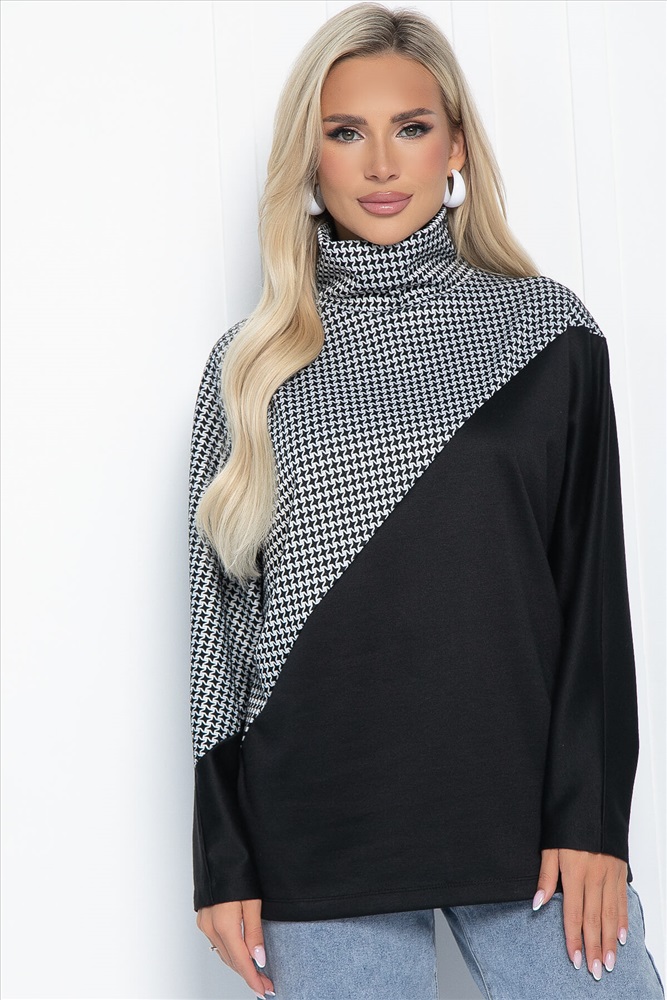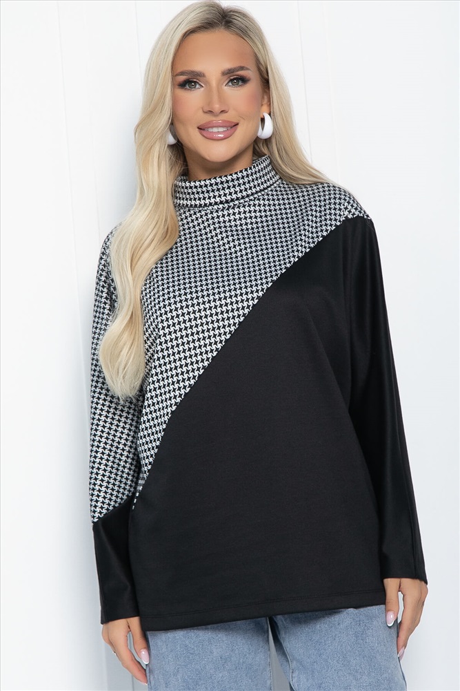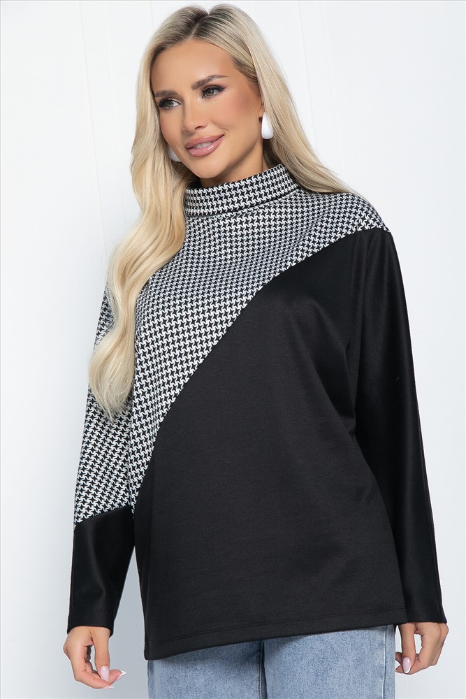 Стильный джемпер ассиметричного кроя и с принтом "гусиная лапка" гармонично украсит любой образ. Джемпер имеет высокую стойку-воротник, что позволяет менять форму воротника, рукава скроены по типу "летучая мышь". Свободный крой позволяет скрыть недостатки фигуры. Такой джемпер отлично будет смотреться, как с брюками, так и с юбкой.