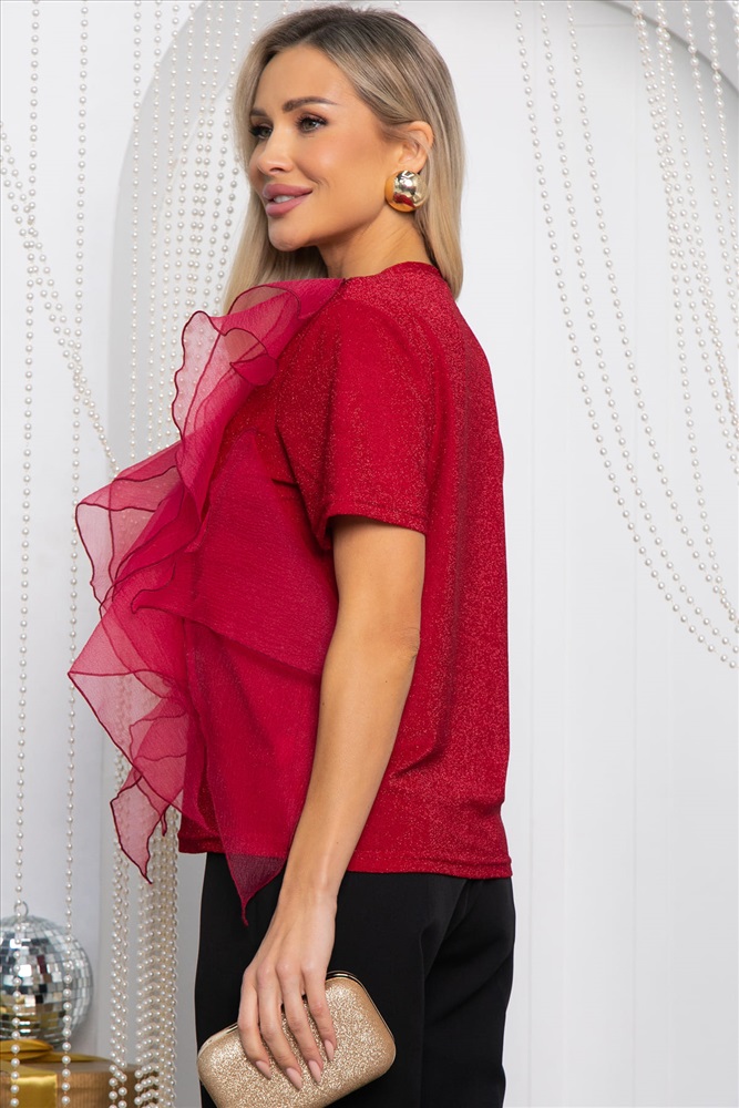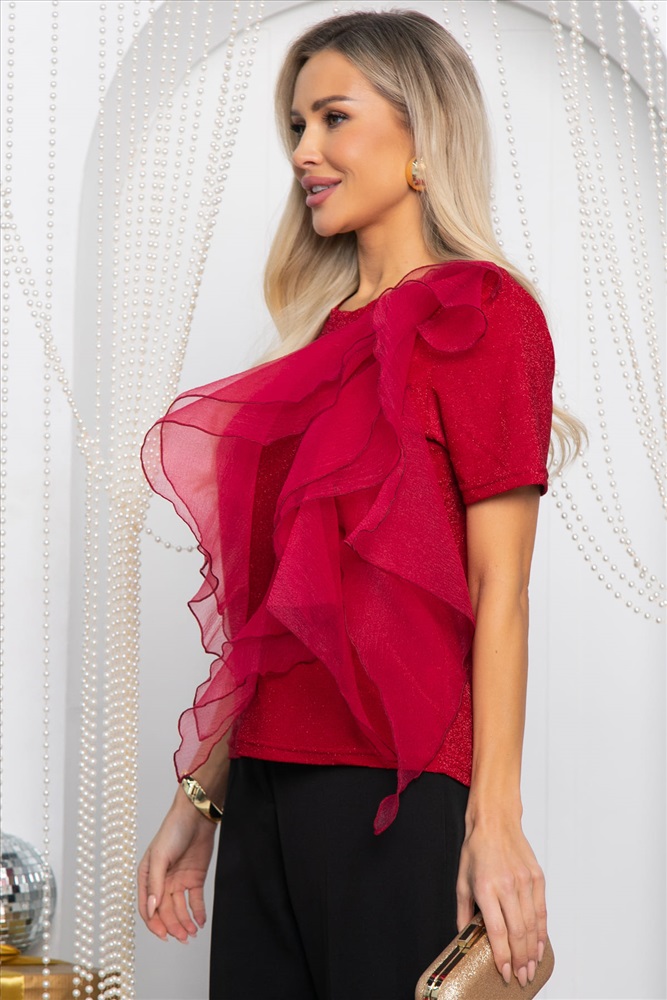 Подарите своему гардеробу нотки праздничной магии с этой изумительной блузкой из трикотажа с люрексом! Волан из органзы добавляет образу легкости и романтичности. Благодаря блестящему люрексу, становится идеальным выбором для праздничных мероприятий и вечерних выходов, позволяя подчеркнуть вашу женственность и очарование.