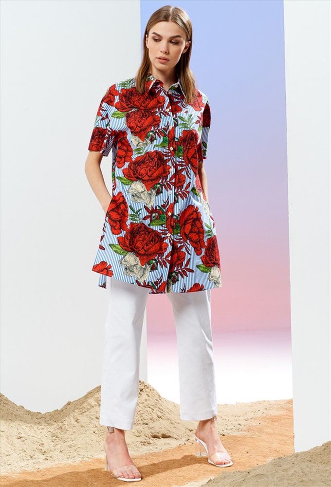 Рубашка прямого силуэта из хлопка с принтом. Рубашечный воротник. Рукава одношовный втачной длиной ¾ , спереди накладные кармашки, по бокам разрезы . По спинке отрезная кокетка и от нее по центу встречная складка. Застегивается на планку с пуговицами.