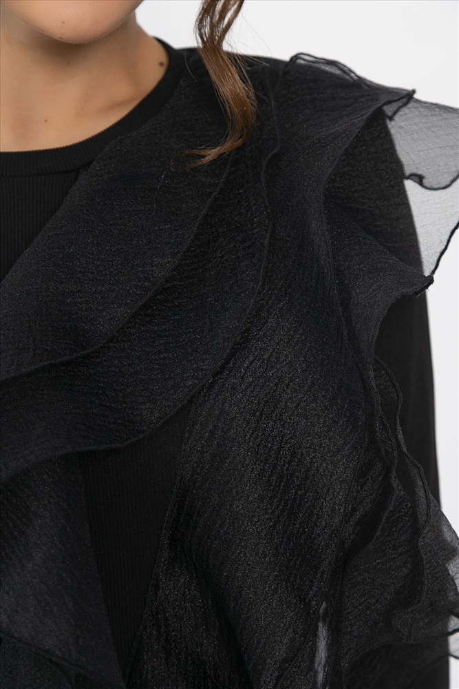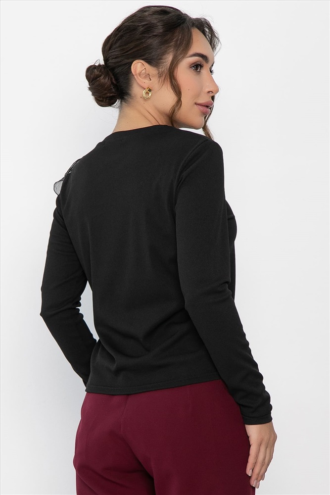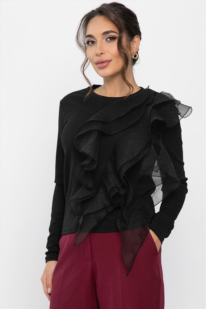Блуза из трикотажного материала «Лапша» с воланами из органзы и длинными рукавами — это прекрасное дополнение к вашему гардеробу! Она станет ярким акцентом как для особых случаев, так и для повседневных выходов. Воланы придают образу лёгкость и романтичность. С этой блузой вы сможете создать стильный и запоминающийся образ!