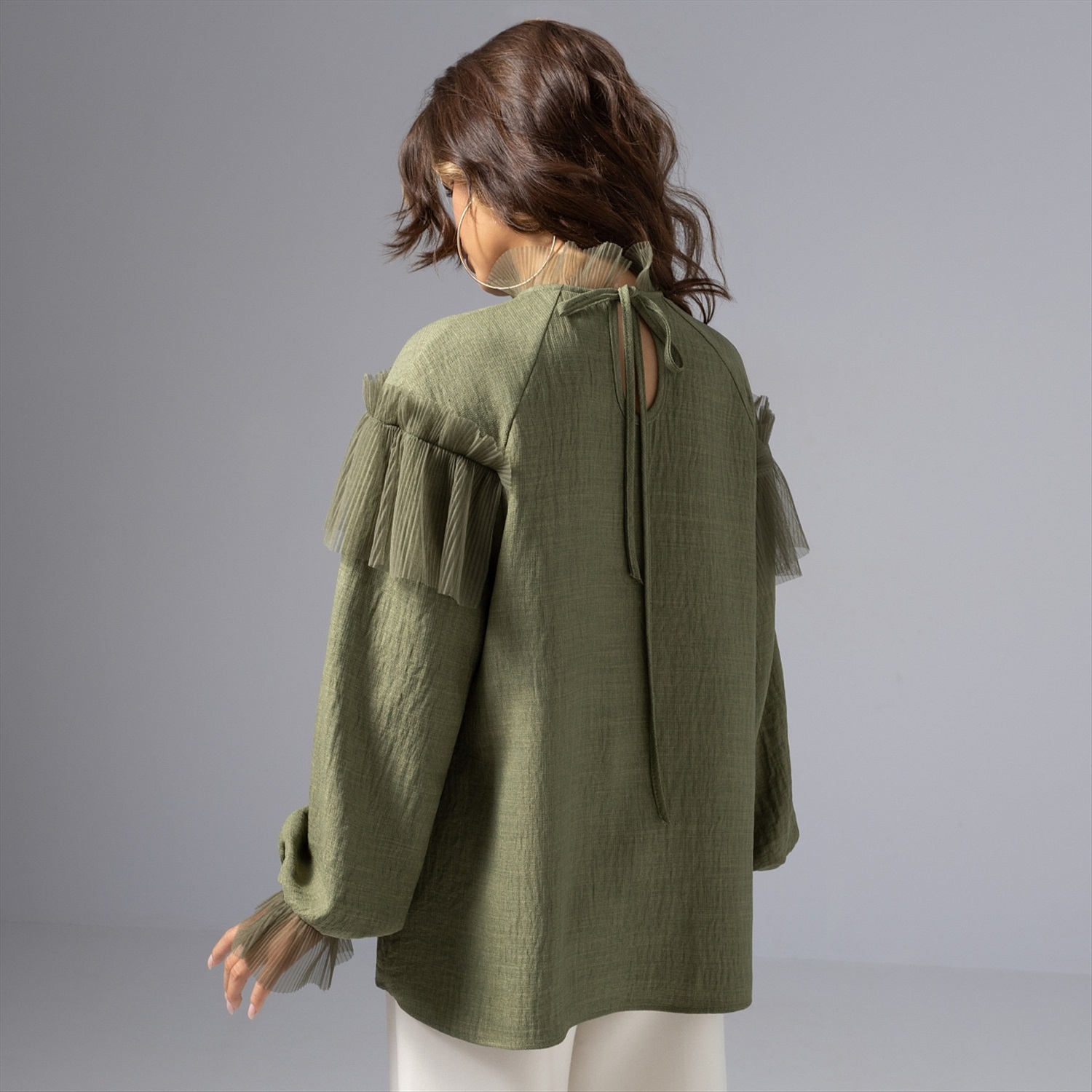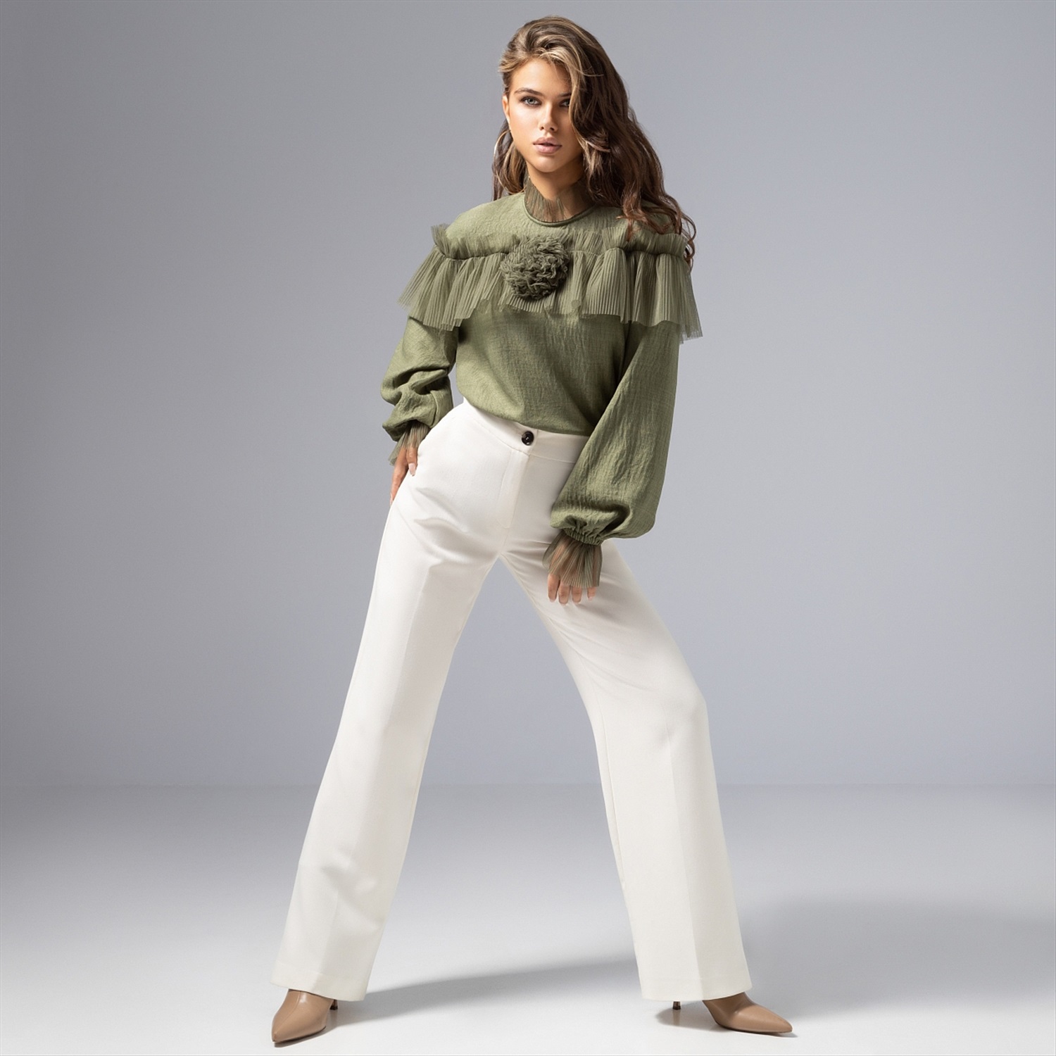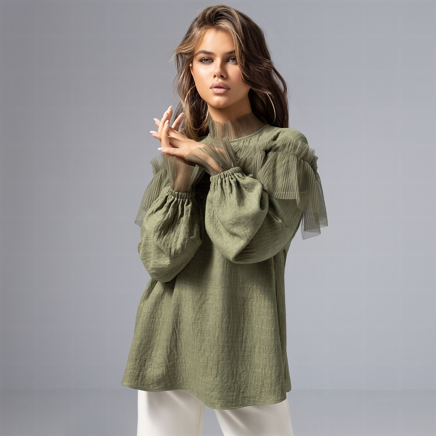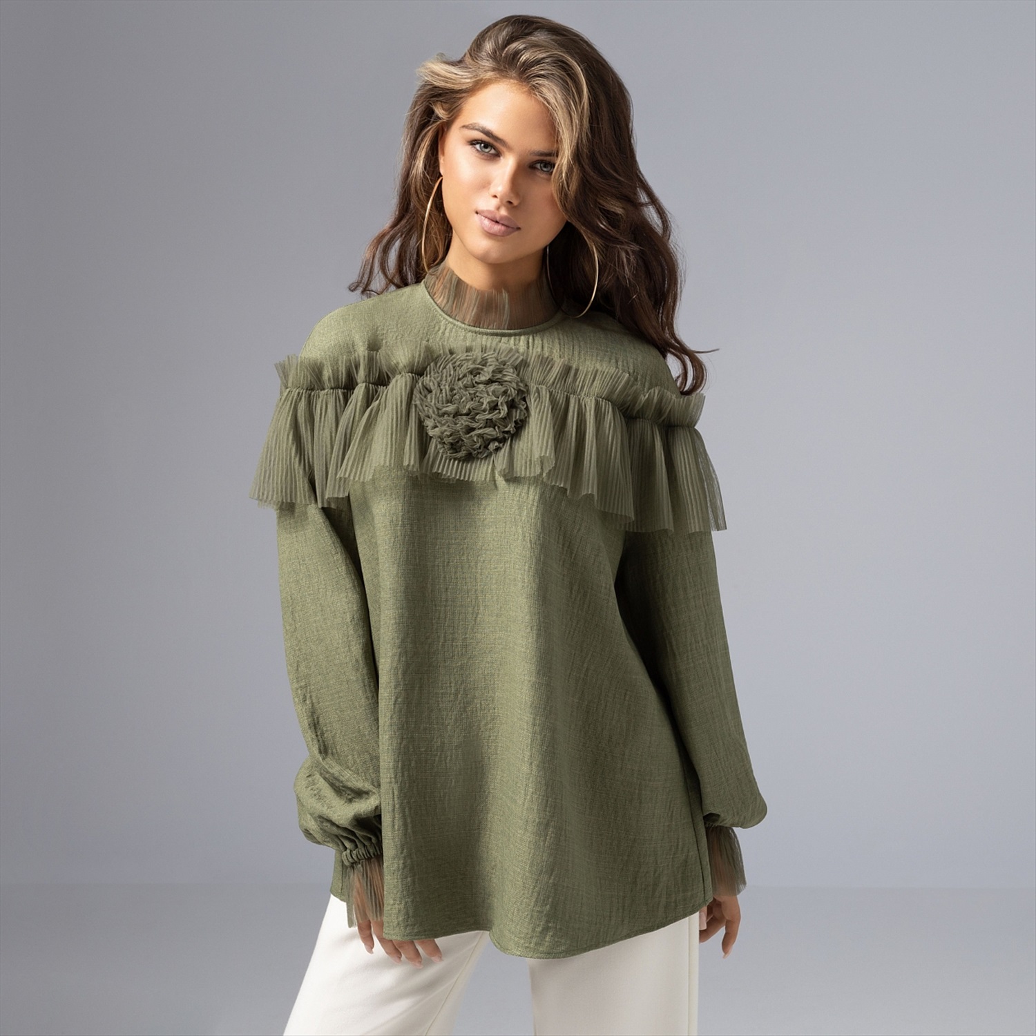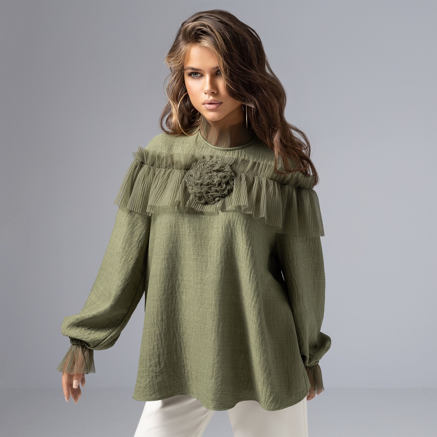 В этой блузе ЧАРУТТИ так легко почувствовать себя лесной нимфой или загадочной дриадой. Мягкая зелень, легкая сетка-гофре, прозрачные волны ткани – словно дуновение ветра в тени волшебных деревьев. Создайте вокруг себя красивую сказку! Эффектная сетка и объемная роза – идеальная комбинация для романтического образа. Свободный крой дарит внутреннюю свободу, полупрозрачные манжеты и ворот делают твой аутфит по-настоящему изысканным.