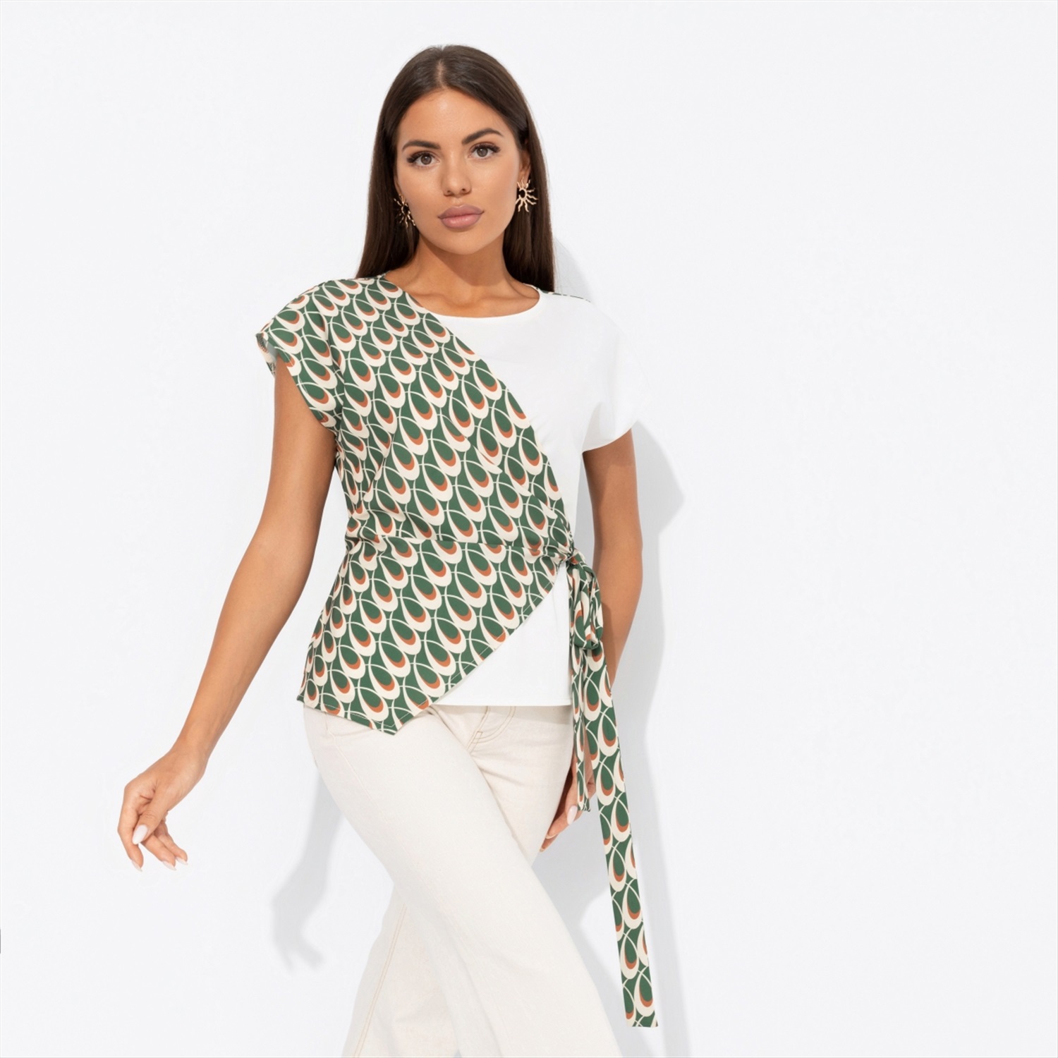 ТН ВЭД: 6206400000; Состав: Ниагара (95% п/а, 5% эластан); Плотность ткани: Средняя; Тип ткани: Текстиль; Вид застежки: Завязки; Декоративные элементы: Завязки; Дополнительный цвет ткани: Белый; Карманы: Нет; Основной цвет ткани: Разноцветный; Отрезная талия: Есть; Подклад: Нет; Резинка по талии: Есть; Рисунок/раппорт: Каждое изделие уникально из-за расположения рисунка на ткани; Сезон: Лето; Силуэт: Приталенный; Стиль: Повседневный