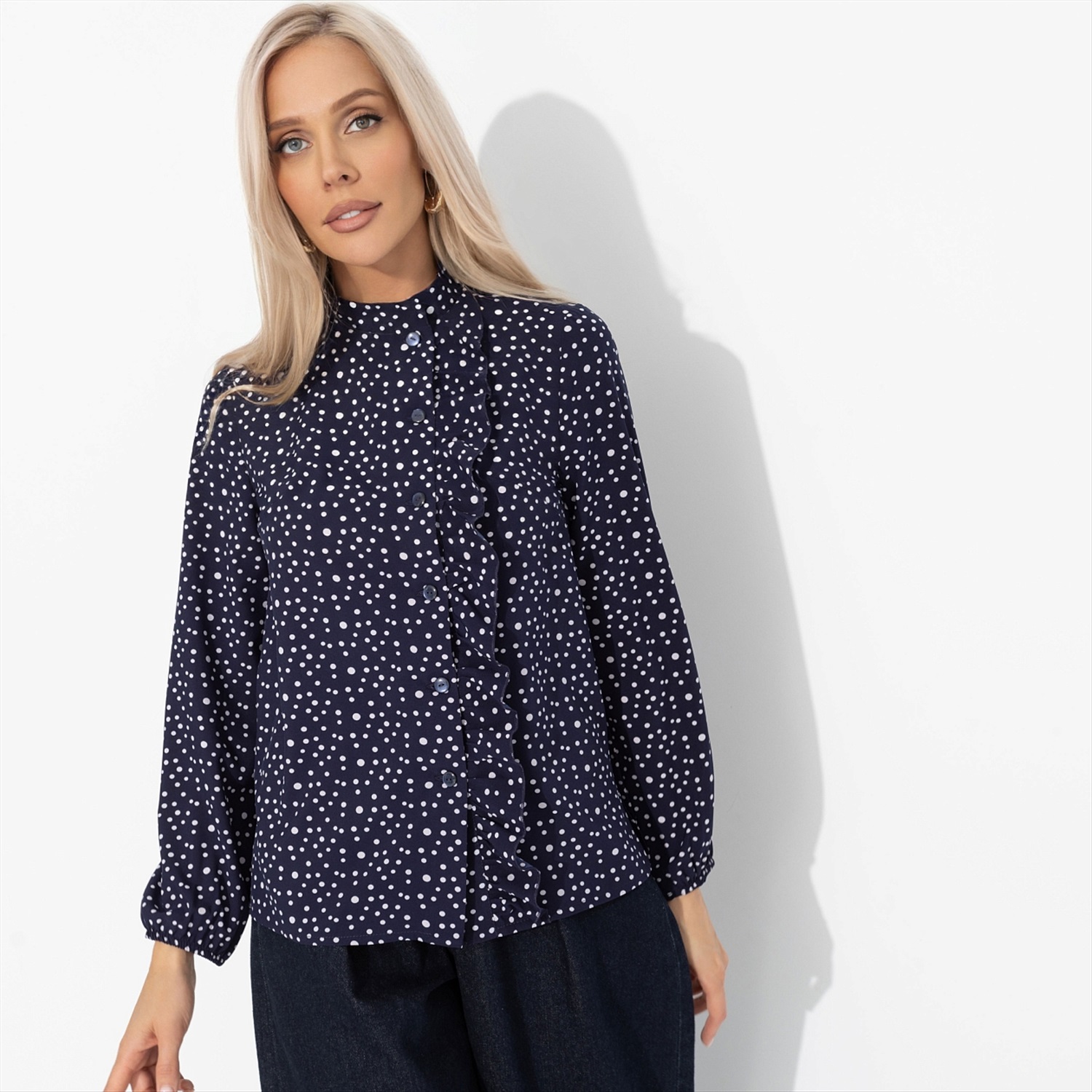 Блуза ЧАРУТТИ, как глава захватывающего романа. Деликатный узор напоминает о легком флирте и поцелуях под дождем. В блузе ЧАРУТТИ кажется, что вот-вот произойдет что-то волшебное — судьбоносная встреча или пустяковый повод заново влюбиться в жизнь. Помните, что любовь часто прячется в мелочах. Блуза приталенного кроя. Воротник-стойка. Расположение пуговиц сбоку. Есть декоративная сборка по линии пуговиц. Изделие хорошо смотрится в заправленном виде и навыпуск.