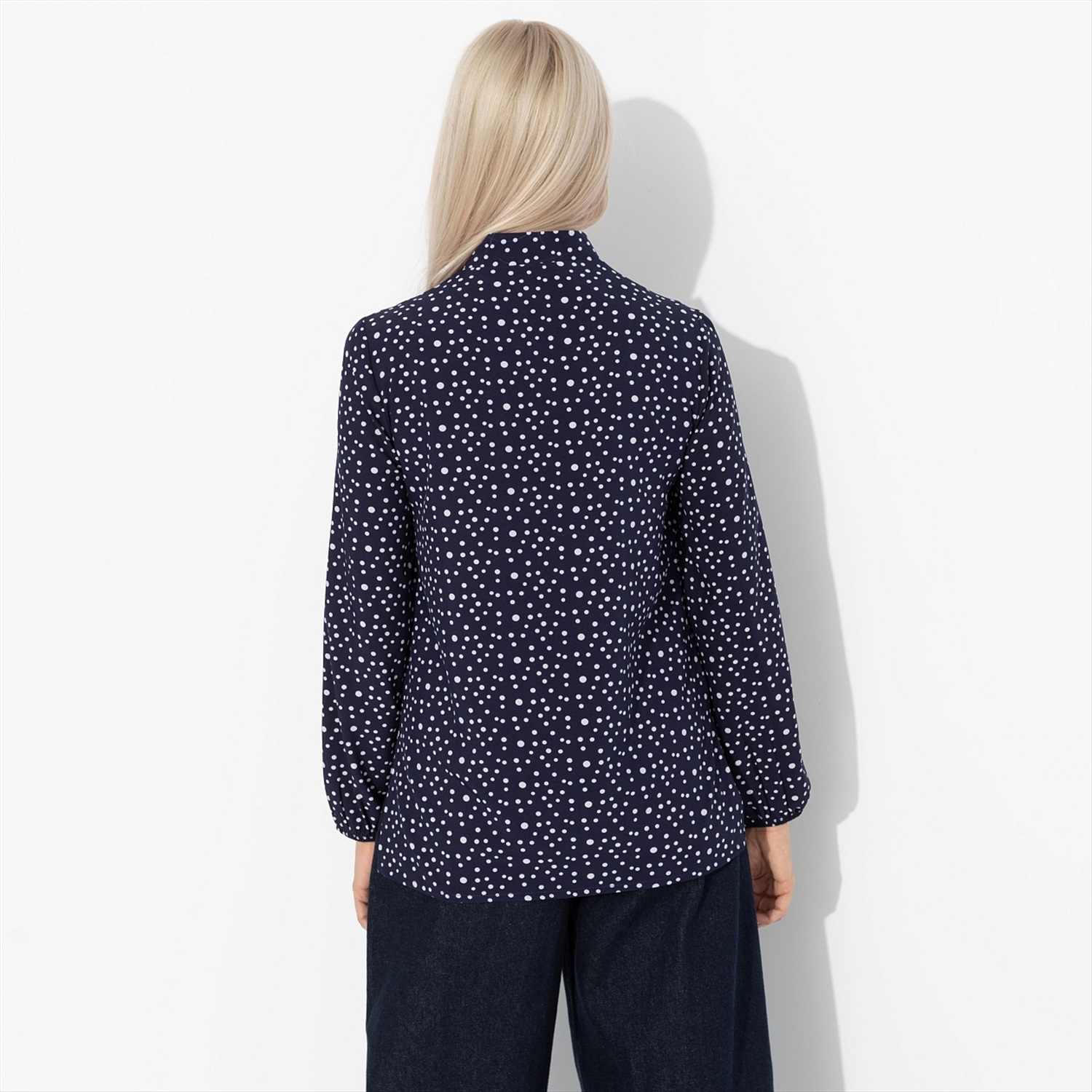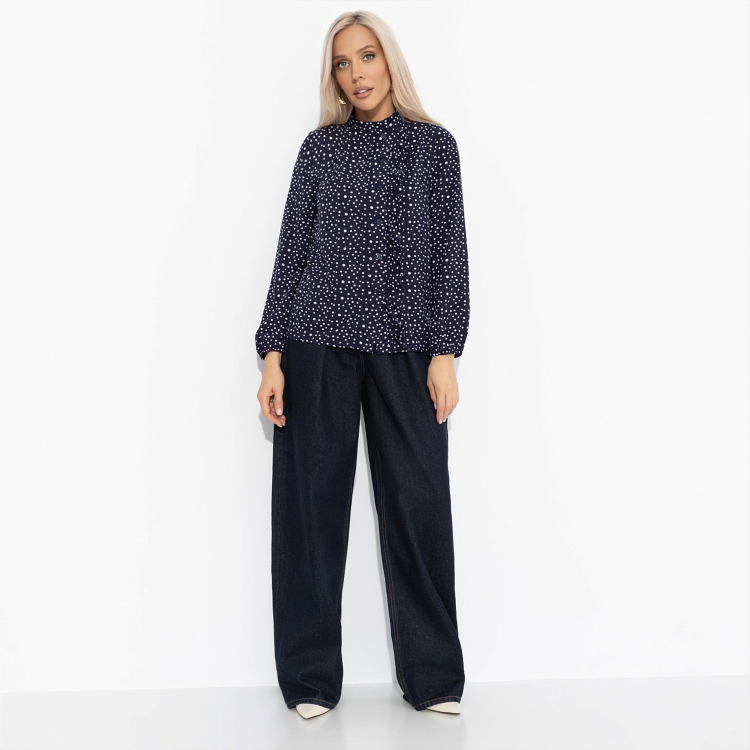 ТН ВЭД: 6206400000; Состав: «Ниагара» (95% п/э, 5% эластан); Плотность ткани: Средняя; Тип ткани: Текстиль; Вид застежки: Пуговица/-ы; Декоративные элементы: Рюши; Дополнительный цвет ткани: Белый; Карманы: Нет; Основной цвет ткани: Синий; Подклад: Нет; Рисунок/раппорт: Каждое изделие уникально из-за расположения рисунка на ткани; Сезон: Круглогодичный; Силуэт: Прямой; Стиль: Повседневный
