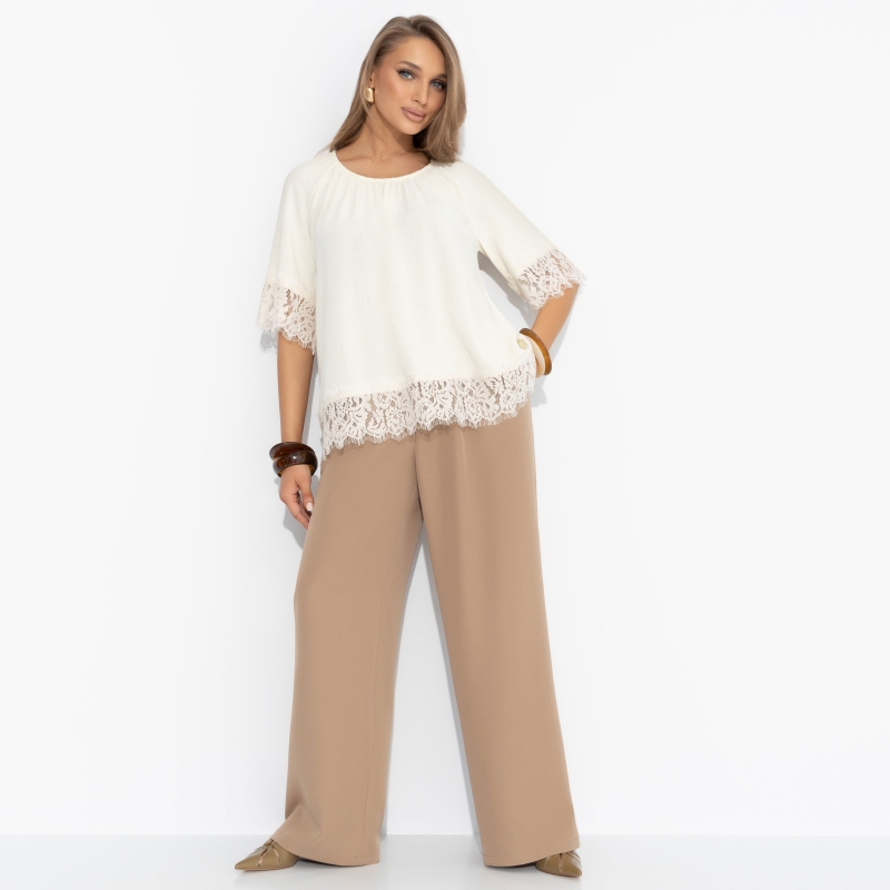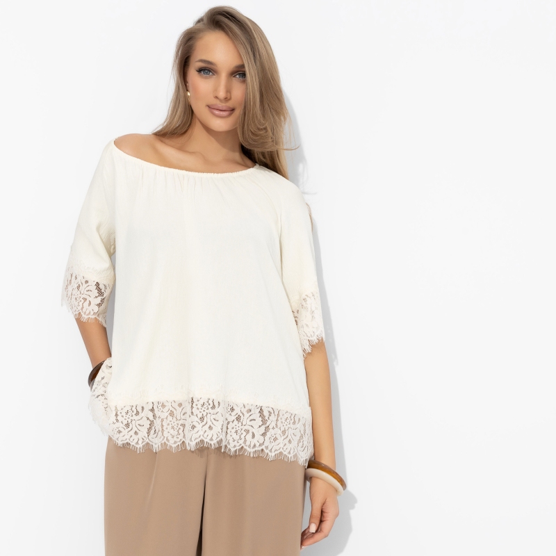 День начинается с новой блузы. Цвет светлой полосы жизни и свободный крой - как синоним вашей личной свободы. Нотки кружева - как штрихи нежности. Вуаля, новая жизнь на пороге. Блуза свободного кроя с красивым круглым вырезом. Линия ворота оформлена скрытой резинкой. Универсальный фасон подойдет любой фигуре и скроет недостатки. Рукава и подол изделия оформлены тонким кружевом.