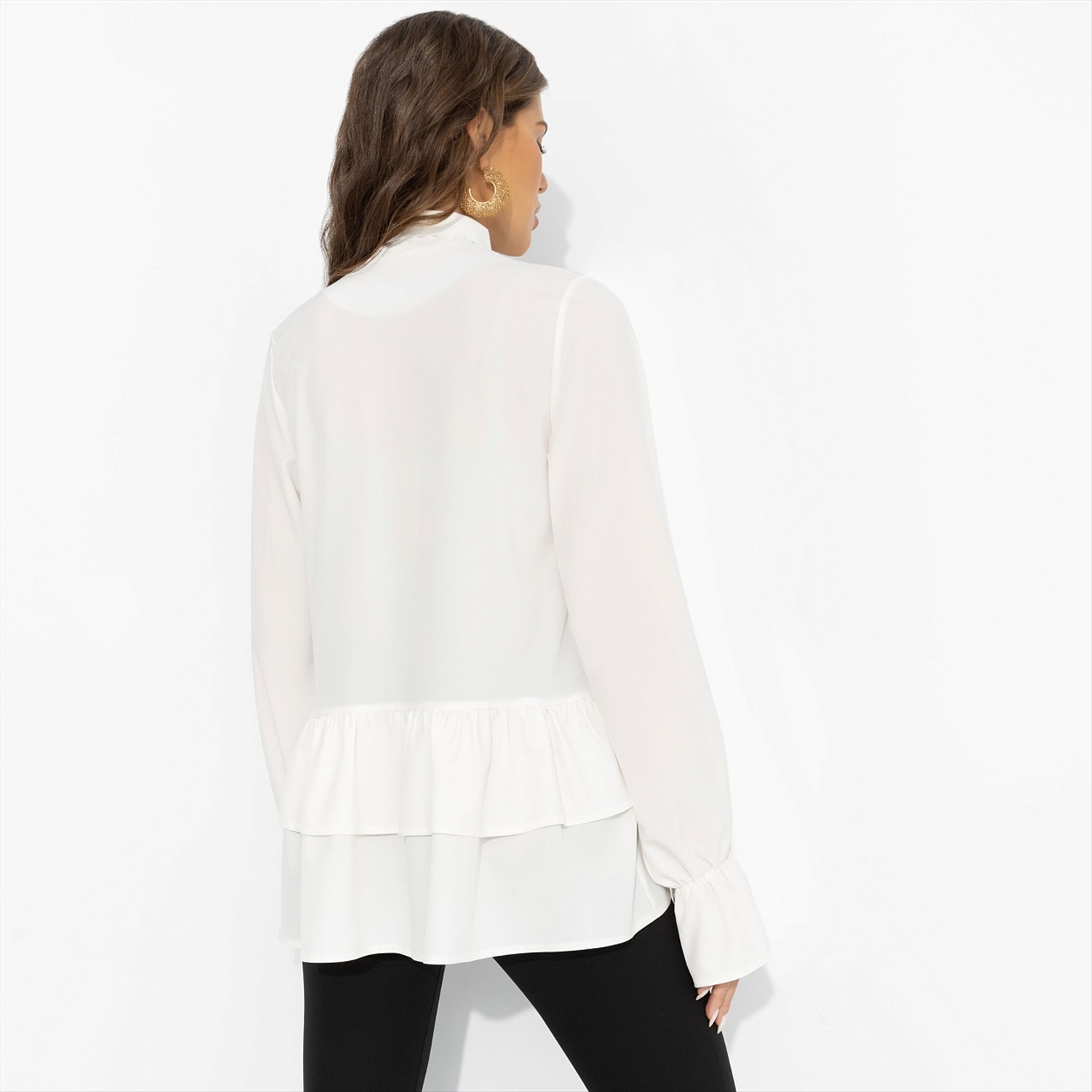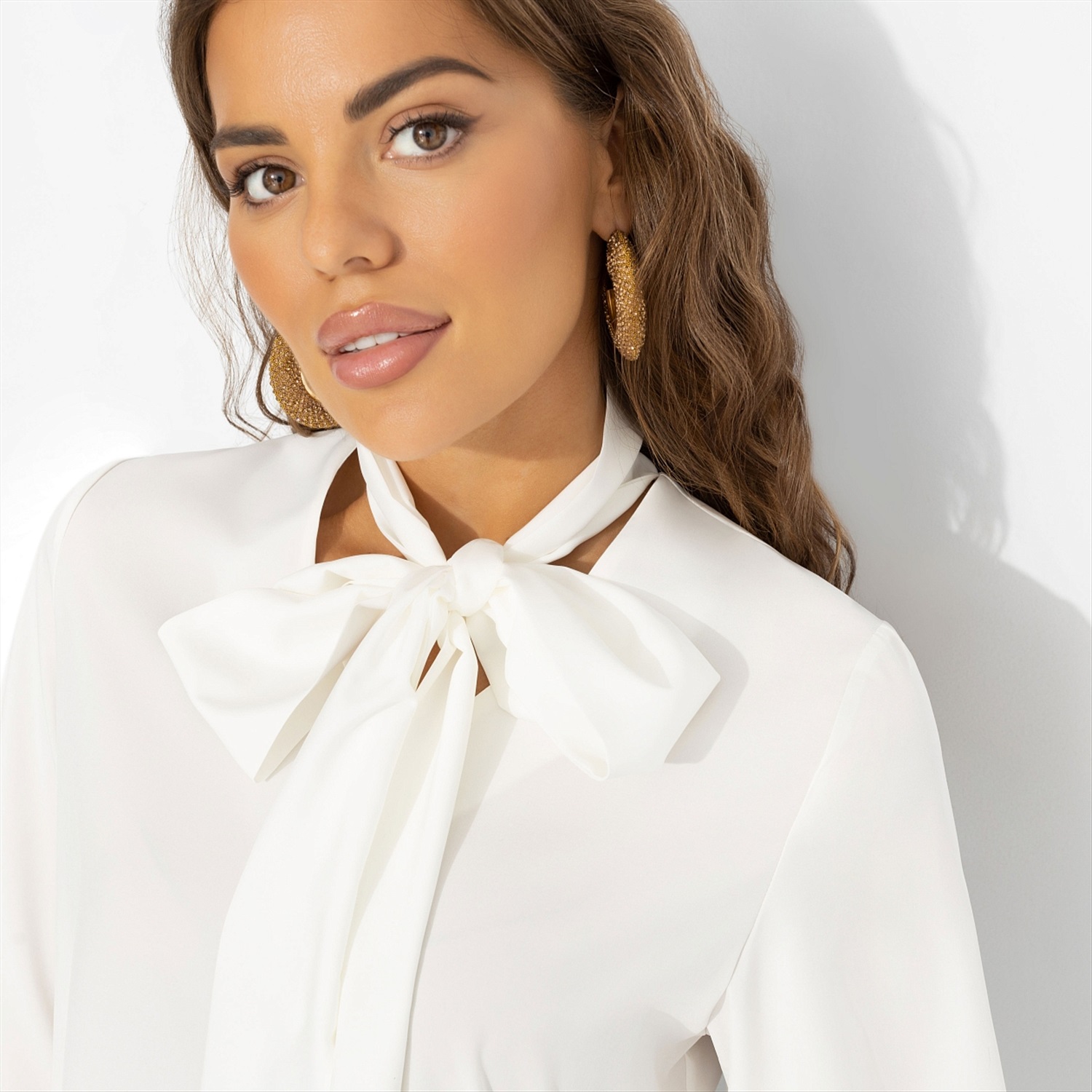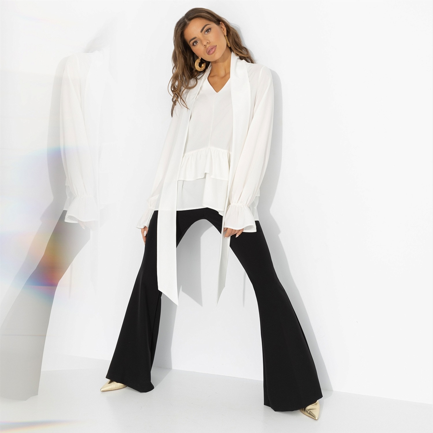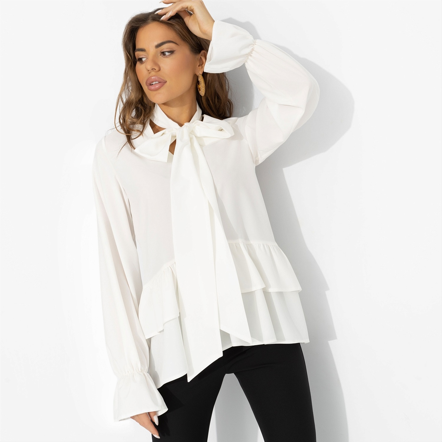 Бохо возвращется – но в своей новой, городской версии. Долой мешковатые силуэты, теперь в тренде изящный белый верх с эффектным бантом и свободными рукавами. В такой блузе легко зайти на вернисаж, затем – на концерт в маленьком баре, оставаясь музой для всех, кто ценит искусство и стиль. Лёгкая блуза с длинными рукавами, акцентным воротником-бантом и мягкой баской у линии бёдер создаёт струящийся силуэт. Сочетается и с широкими брюками, и с джинсами, добавляя в образ тот самый богемный штрих.