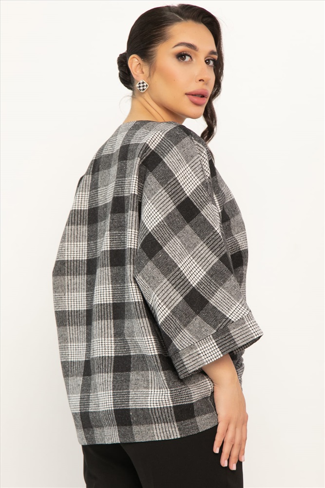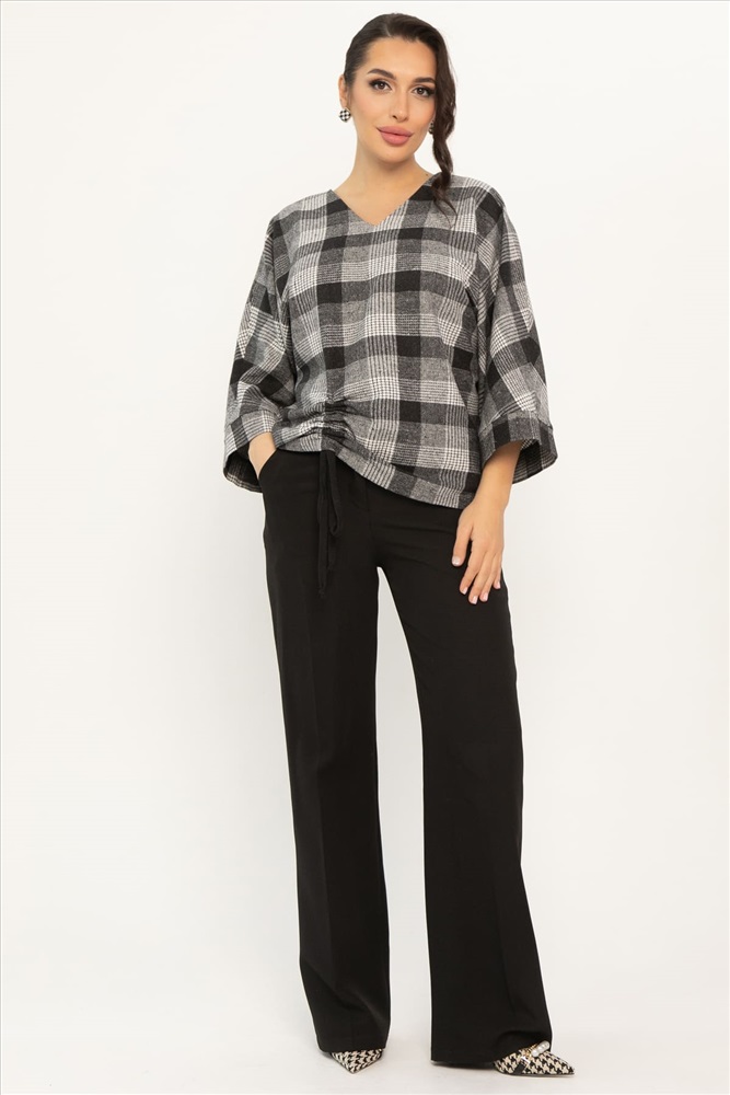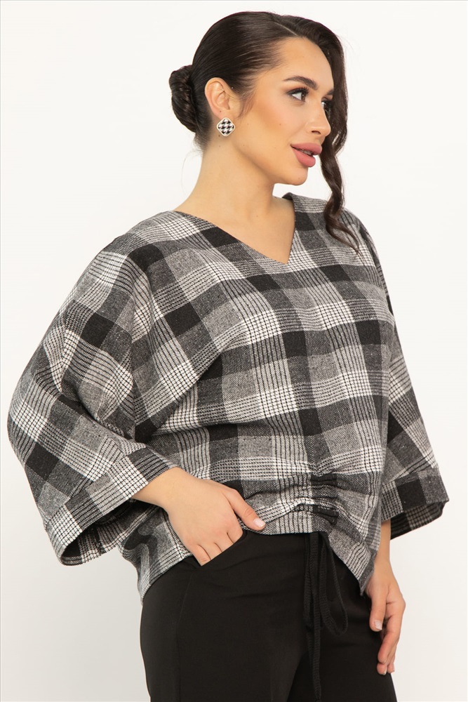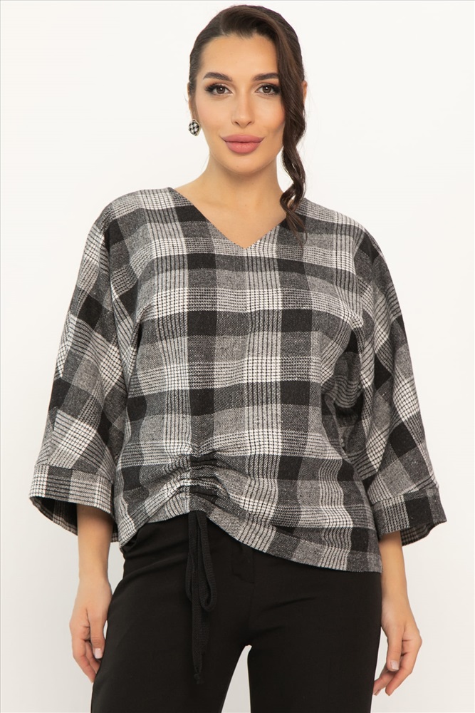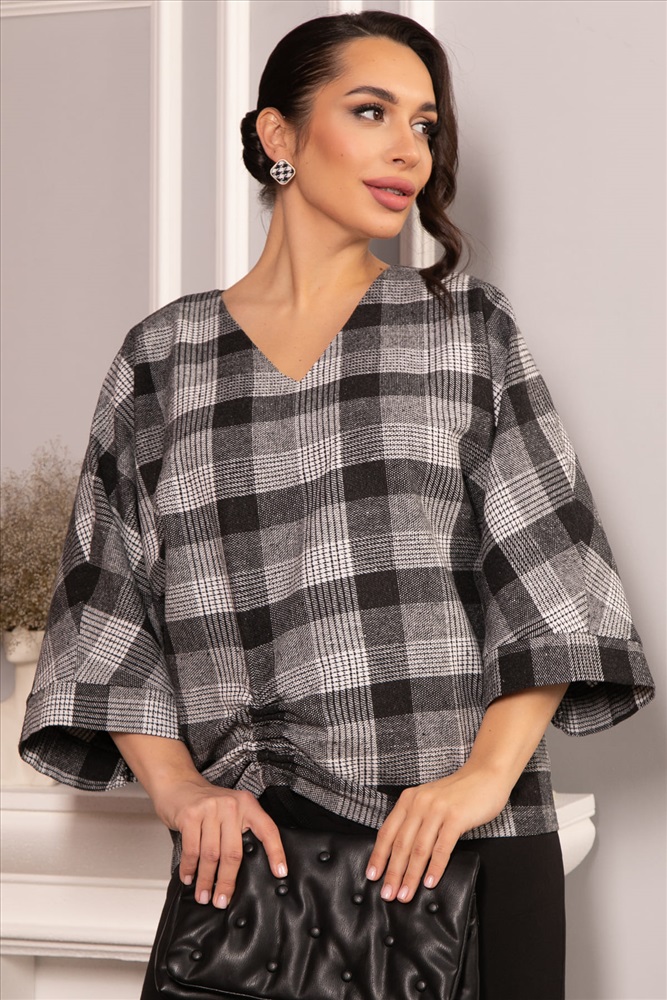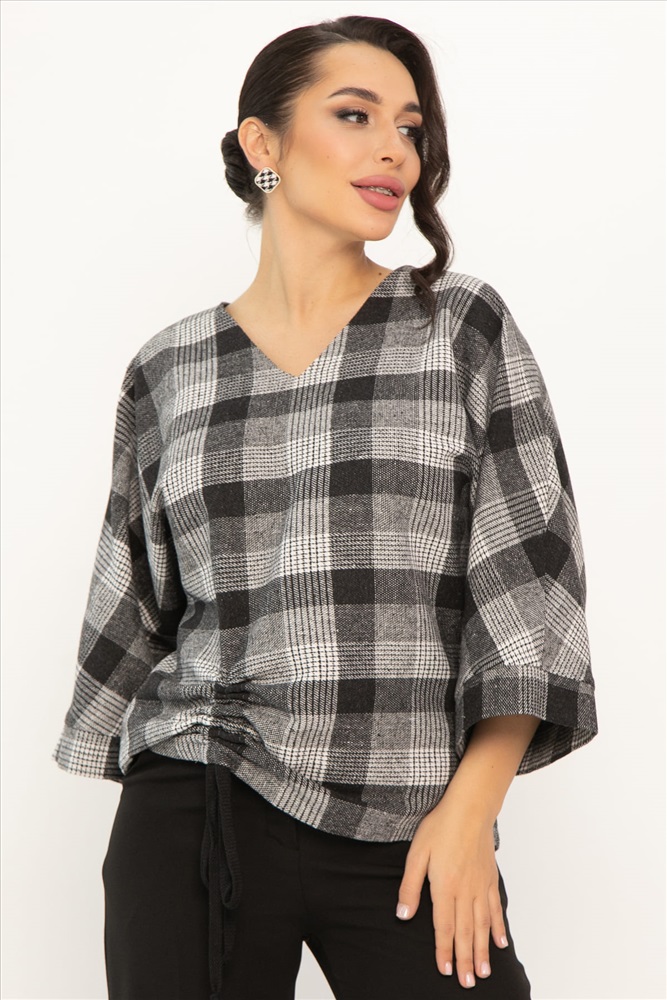 Блузка свободного кроя в клетку — это то, что вам нужно! V-образный вырез подчеркнёт вашу шею, а цельнокроеные рукава с манжетами придадут образу элегантности. Блузка украшена кулиской спереди — это изящная деталь, которая сделает ваш образ неповторимым. Блузка идеально подойдёт для прогулок, встреч с друзьями или уютных вечеров дома. Позвольте себе быть яркой и стильной с нашей оригинальной женской блузкой!