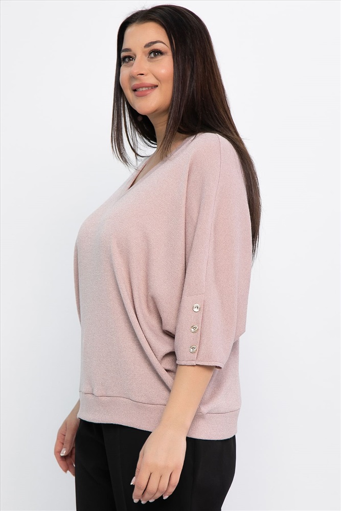 Этот уютный трикотажный джемпер с рукавами летучая мышь в пудровом цвете — идеальное сочетание комфорта и стиля. Благодаря свободному крою и мягкому материалу он создает ощущение легкости и свободы движений, а V-образный вырез добавляет нотку элегантности и женственности. Идеальный выбор для прохладных дней, когда хочется выглядеть стильно и чувствовать себя уютно в любой ситуации. Рукава цельнокроеные, украшенные тремя пуговицами с каждой стороны. Есть притачной пояс по низу изделия.