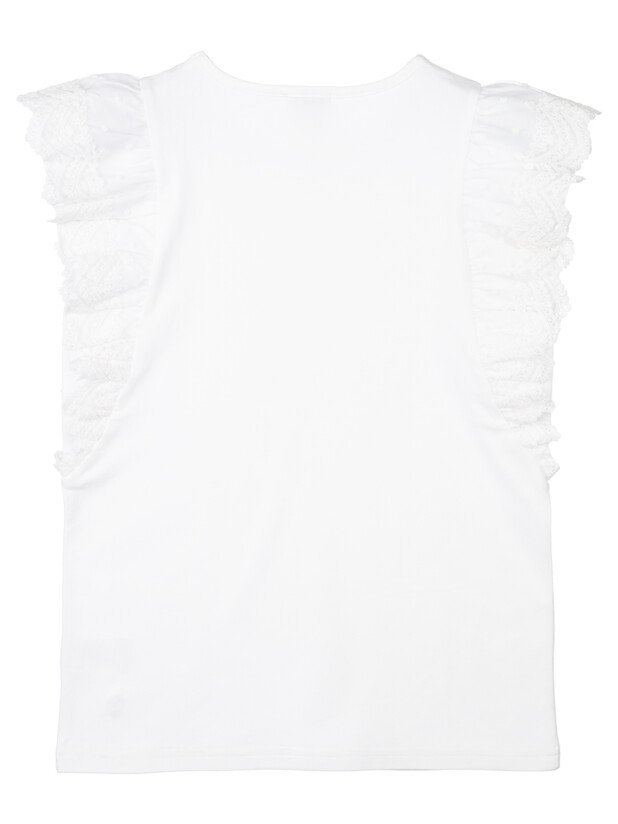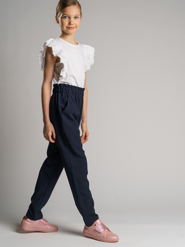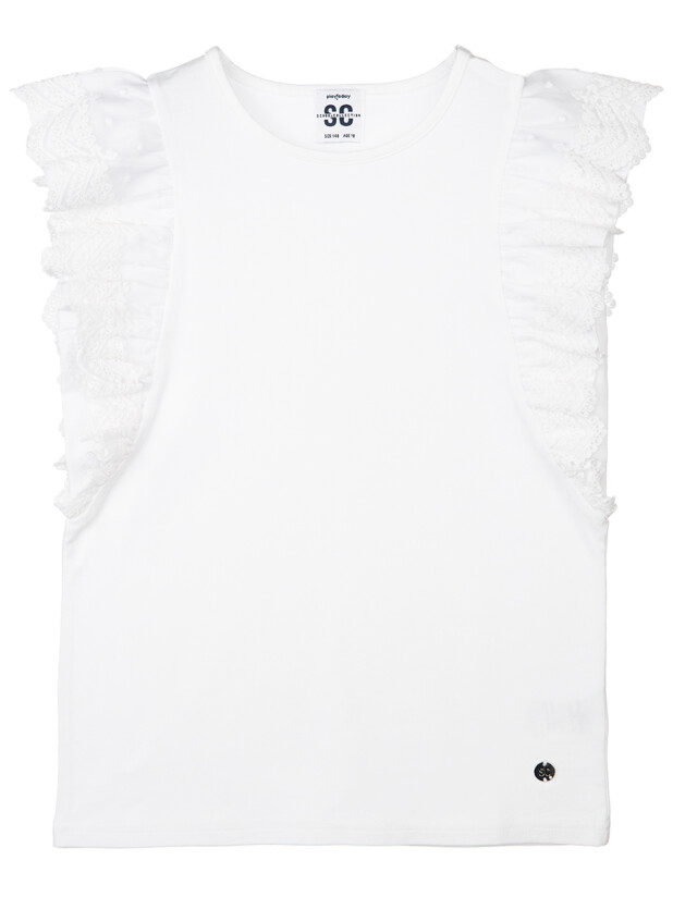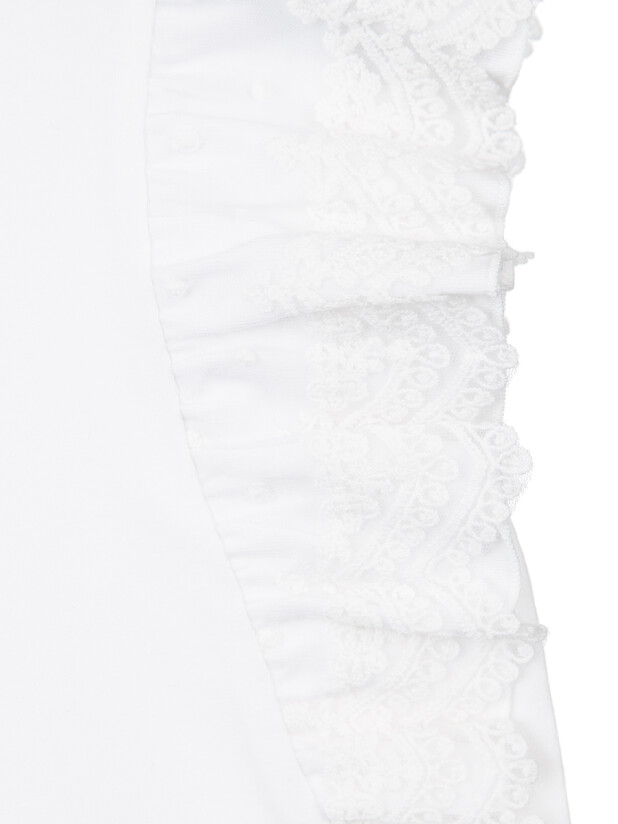 Белая нарядная трикотажная блузка прямого силуэта для девочки подростка - прекрасная альтернатива текстильной блузке или рубашке. Школьная блузка очень мягкая и приятная на ощупь, блузка хорошо держит форму, проста в эксплуатации и уходе. Высокое содержание хлопка 95%. Благодаря наличию эластана в составе ткани изделие проще в уходе и держит форму. Рубашка в школу с рукавами-"крылышками" из кружева разнообразит повседневные школьные образы.