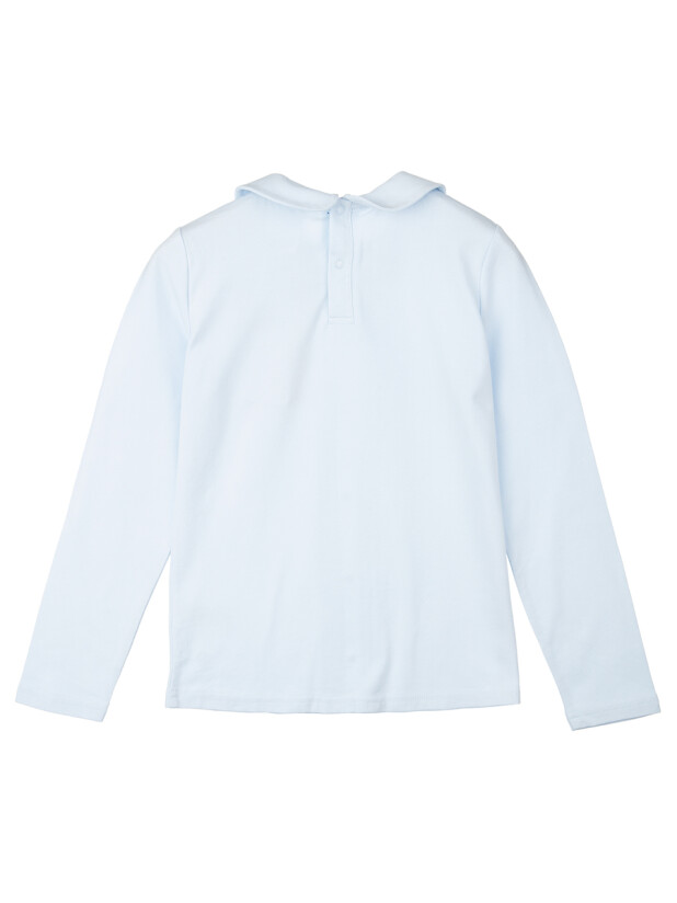 Голубая трикотажная блузка для девочки-подростка от PlayToday — стильная и удобная альтернатива классической школьной рубашке.