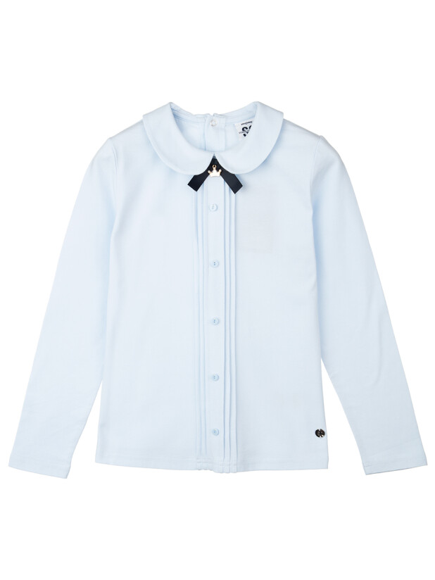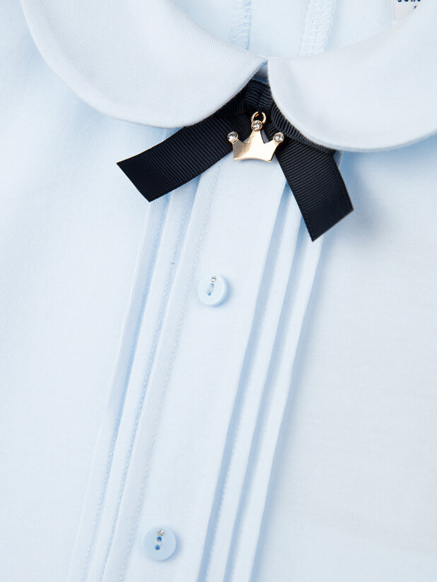 Прямой силуэт сидит аккуратно и удобно на подростковой фигуре. Застёжка на кнопках расположена сзади — ребёнку легко и удобно надевать блузку самостоятельно. Центр полочки украшен изящными узкими складками и пуговицами, инкрустированными стразами — акцент на стиль и индивидуальность. Дополняет образ круглый воротничок с декоративным бантом, который делает модель особенно нарядной.