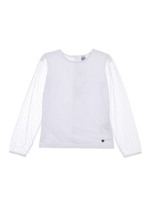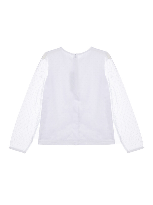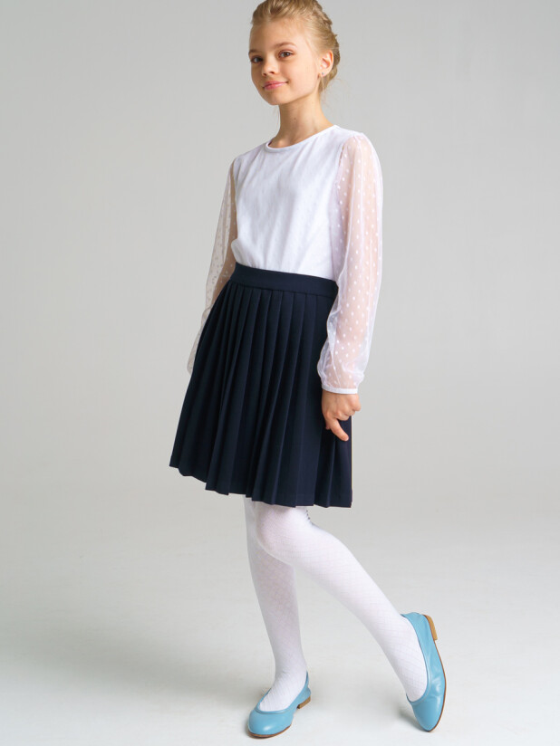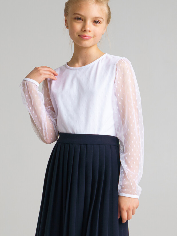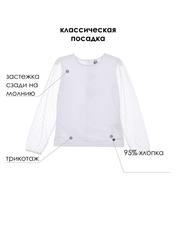 Белая нарядная трикотажная блузка прямого силуэта для девочки подростка - прекрасная альтернатива текстильной блузке или рубашке. Школьная блузка очень мягкая и приятная на ощупь, блузка хорошо держит форму, комфортна в носке и проста уходе. Подкладка из трикотажа джерси с высоким содержанием хлопка 95%. Блузка в школу с длинным рукавом и декором из сетки разнообразит повседневные образы школьницы. Застежка – молния на спинке.