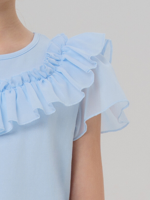 Прямой аккуратный крой с коротким рукавом делает модель универсальной: удобно в классе, на переменах и на линейках. Нарядный акцент — нежная рюша из шифона по горловине — добавляет образу изящества и праздничного настроения.