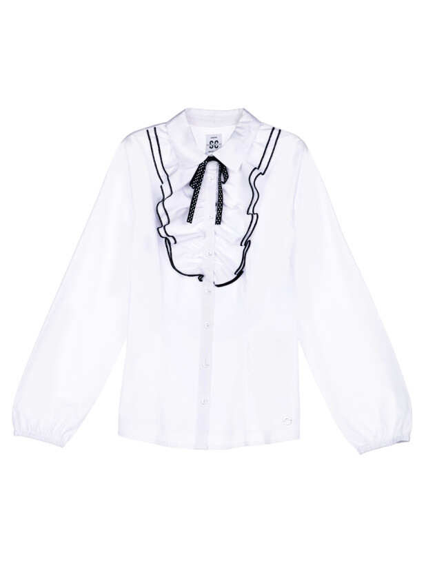Белая нарядная текстильная блузка полуприлегающего силуэта, приталенная для девочки подростка. Школьная блузка на пуговицах хорошо держит форму, комфортна в носке и проста в уходе. Высокое содержание хлопка. Рубашка в школу с длинным рукавом и декоративной рюшей разнообразит повседневные школьные образы.