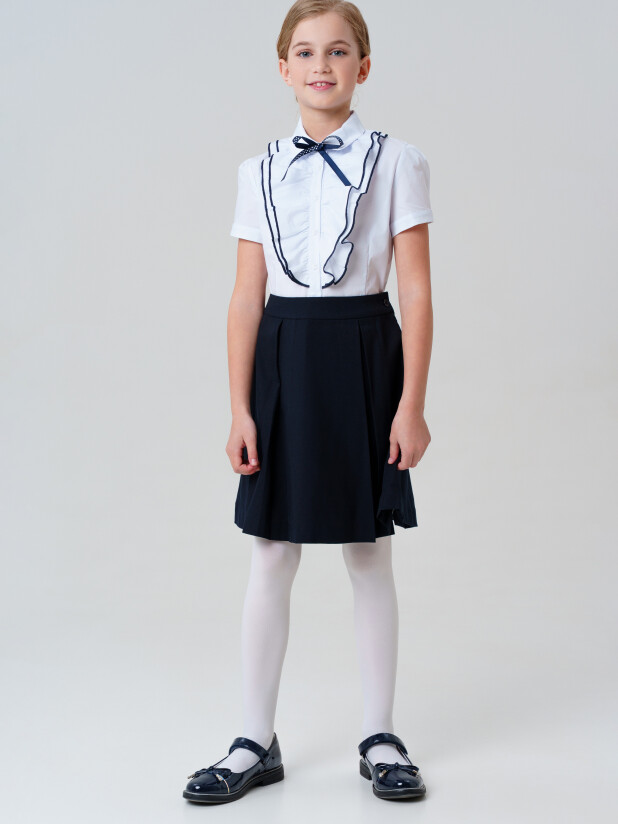 Продуманный полуприлегающий крой с лёгким акцентом на талию подчёркивает силуэт, но не сковывает движений. А короткие рукава и воротник с рюшами добавляют образу лёгкости и особого настроения — такая деталь точно не останется незамеченной. Застёжка на пуговицах спереди — практичное и удобное решение для школы.