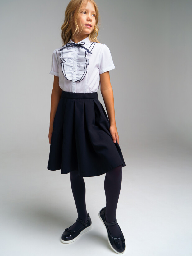 Совет по стилю: для повседневных школьных образов сочетайте блузку с однотонными юбками, сарафанами или брюками. Для более нарядного образа — добавьте жакет или жилет от PlayToday. Подойдёт и на 1 сентября, и на последний звонок, и для выпускного в начальной школе.