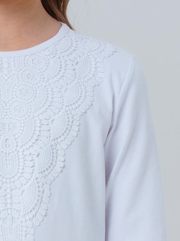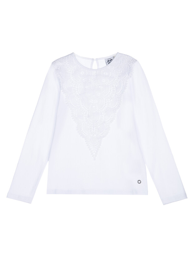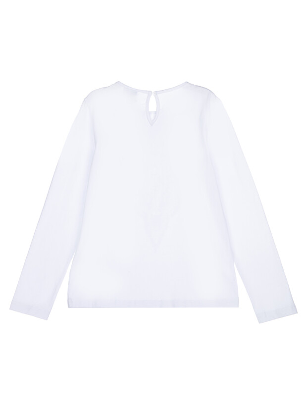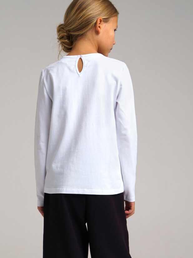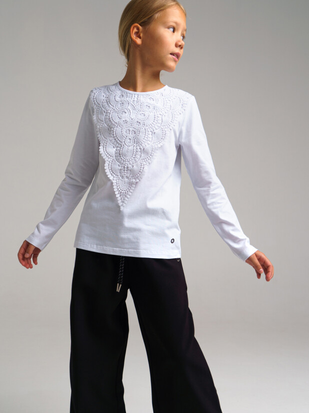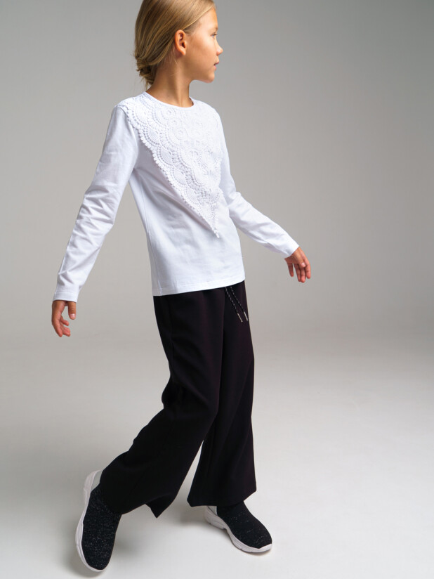 Белая трикотажная блузка для девочки-подростка от бренда PlayToday из школьной коллекции — стильный и комфортный вариант для школы и торжественных мероприятий.