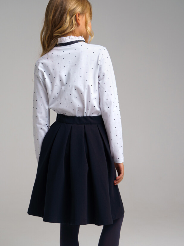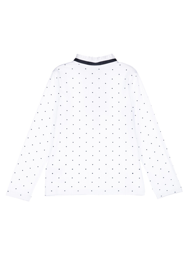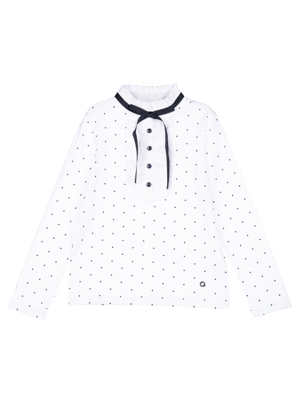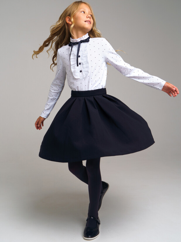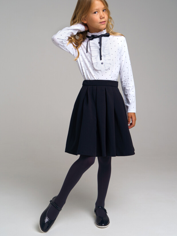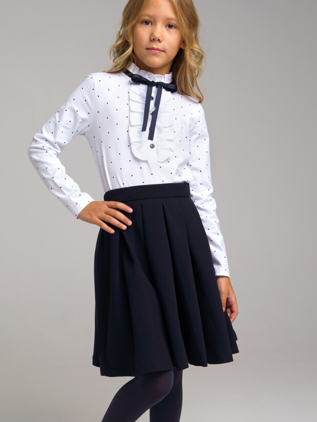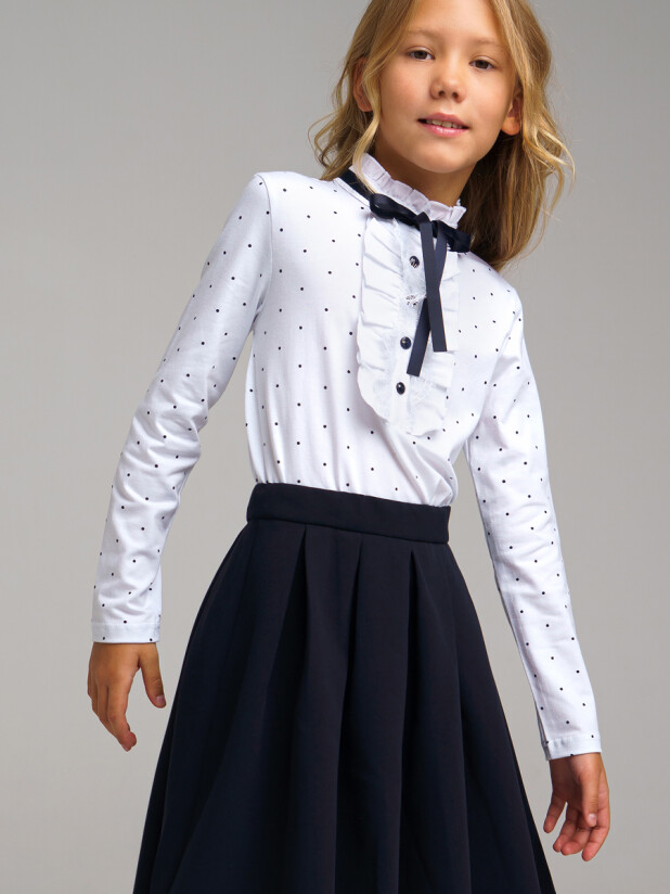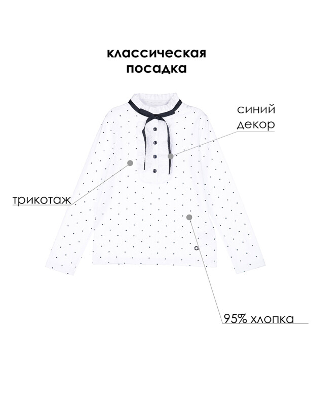 Белая трикотажная блузка прямого силуэта для девочки подростка - прекрасная альтернатива текстильной блузке или рубашке. Школьная блузка на пуговицах очень мягкая и приятная на ощупь, блузка хорошо держит форму, комфортна в носке и проста уходе. Высокое содержание хлопка 95%. Благодаря наличию эластана в составе ткани, изделие проще в уходе и держит форму. Блузка в школу с длинным рукавом и декором из ткани и кружева разнообразит повседневные образы школьницы. Воротник стойка декорирован рюшей и бантом.