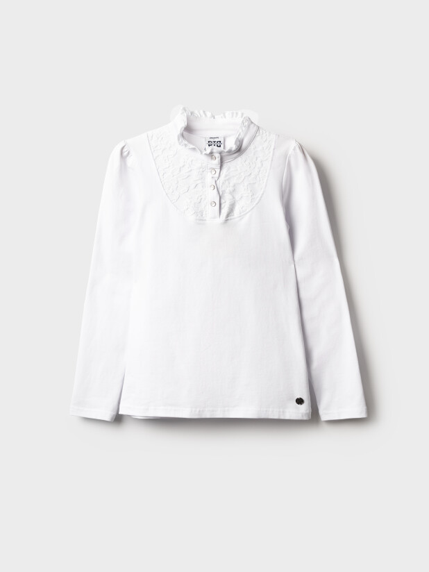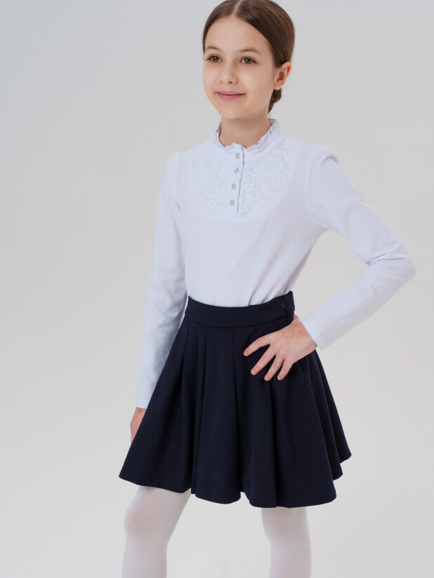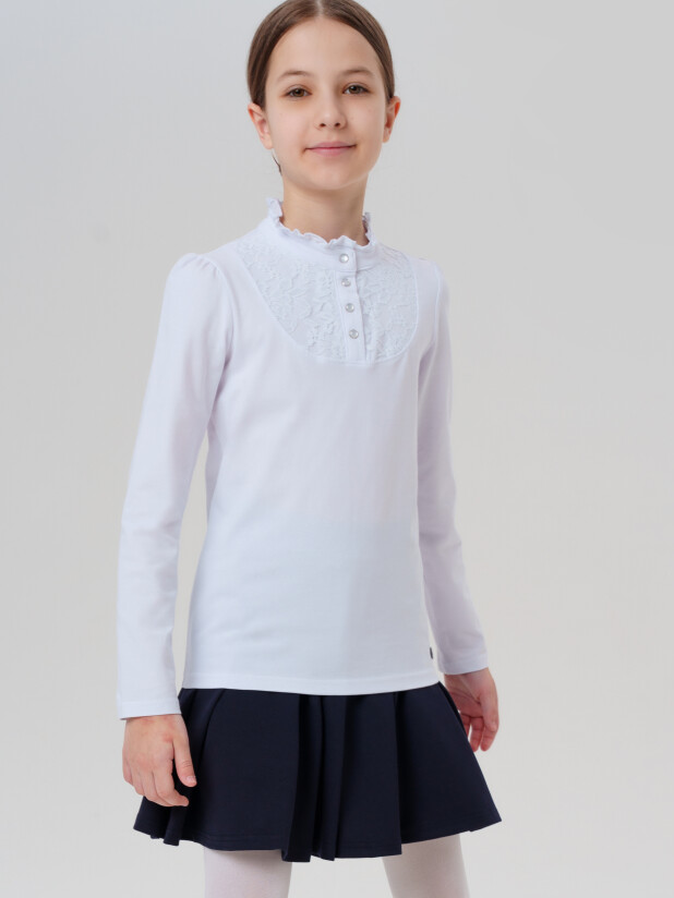 Полуприлегающий крой аккуратно садится по фигуре и при этом дарит свободу движений — ребёнку будет удобно и на уроках, и на переменах. Воротничок-стойка с декоративной рюшей и изящная кружевная кокетка спереди делают образ особенно нарядным и элегантным. Застёжка на кнопки практична и удобна — ребёнок легко справится сам.