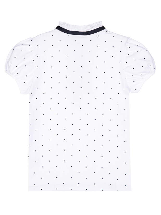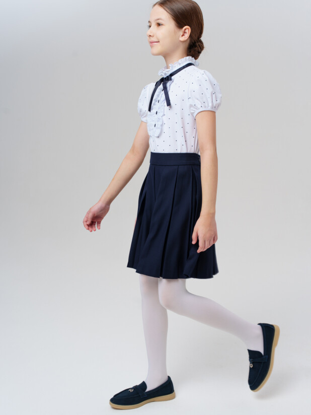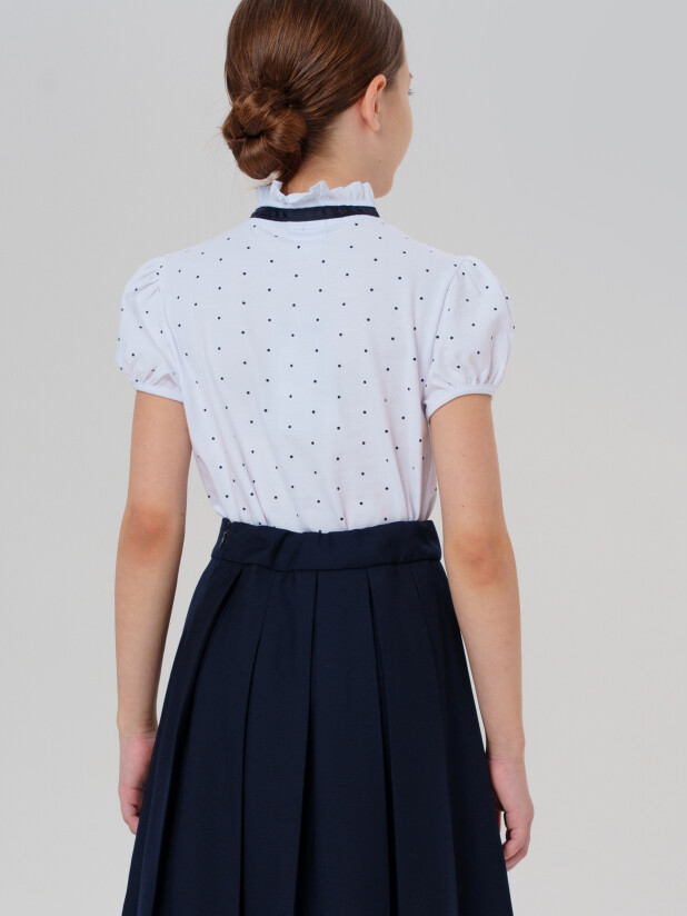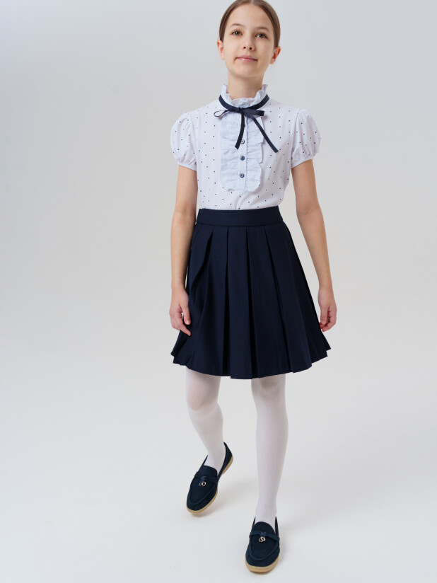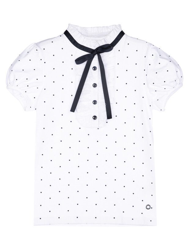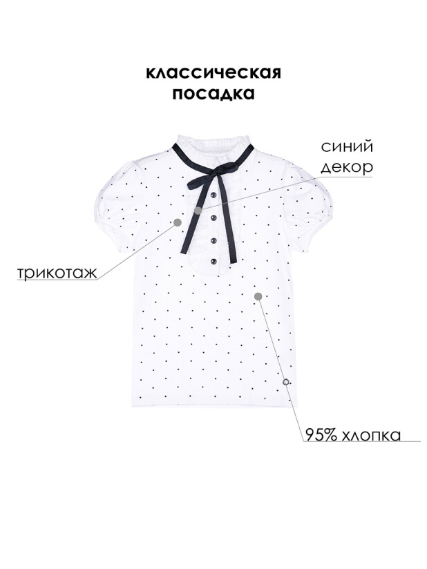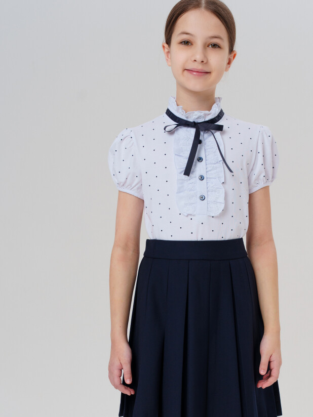 Полуприлегающий силуэт дарит свободу движений, а нежные детали — жабо из ткани с кружевом и бант на воротнике — добавляют образу нарядности и утончённости. Эта блузка с коротким рукавом легко вписывается в школьный дресс-код.