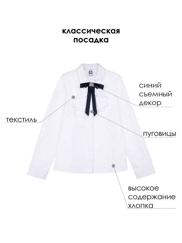 Уход максимально простой: блузка сохраняет форму после множества стирок при 30°C, не требует сложного ухода и остаётся аккуратной весь учебный год.