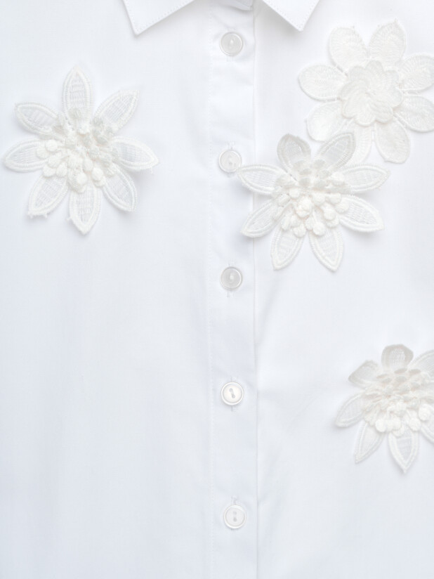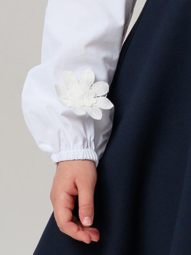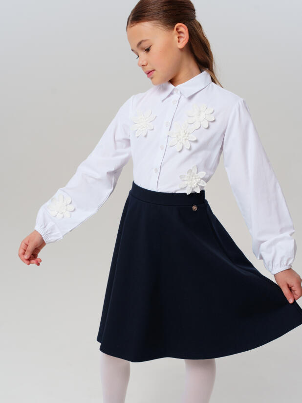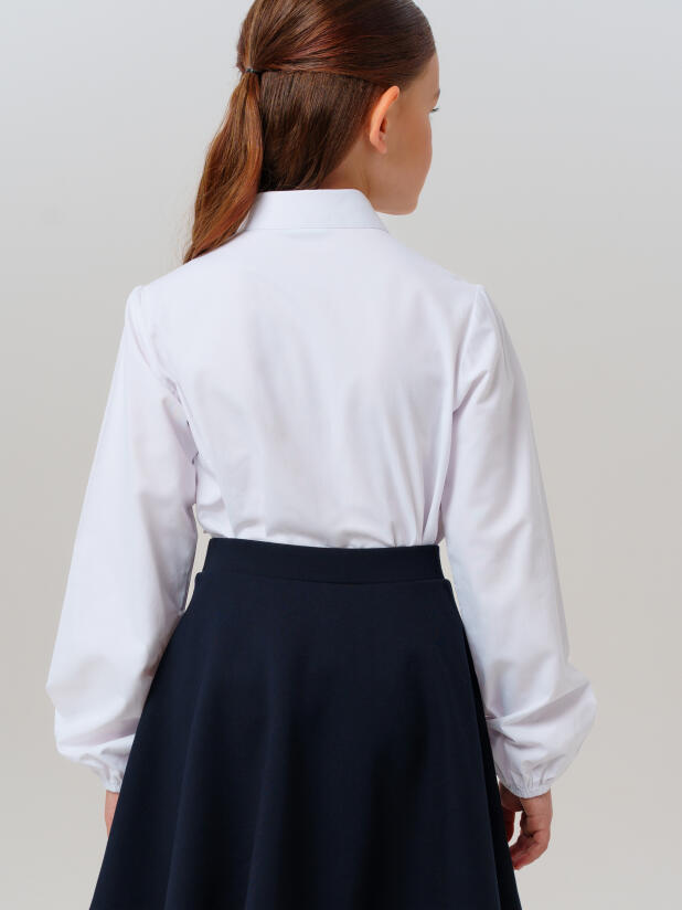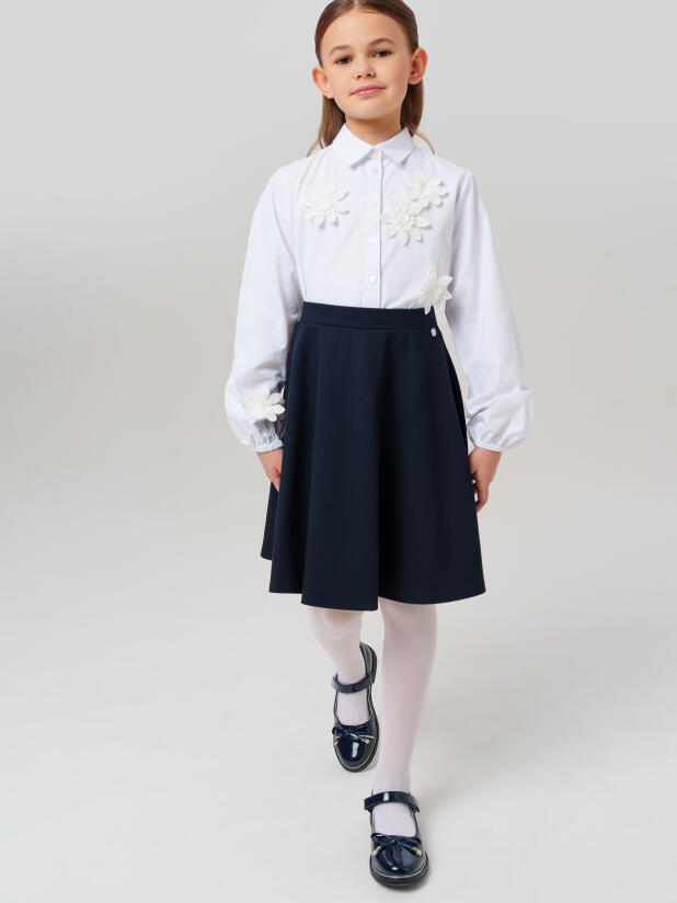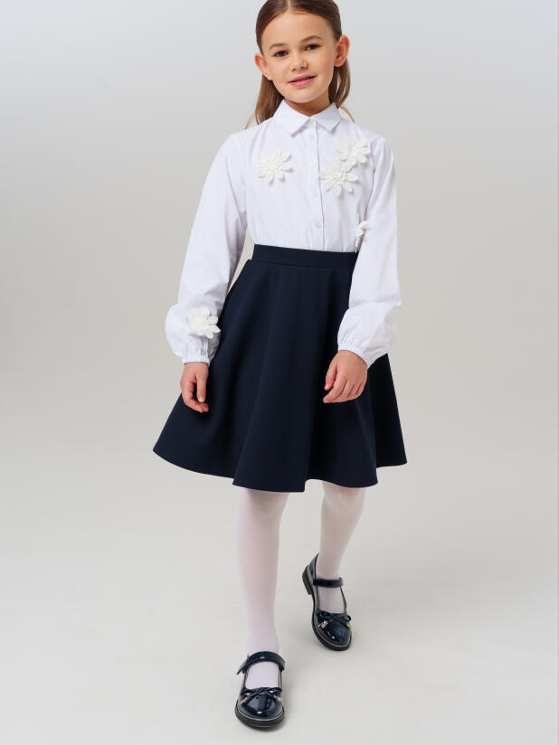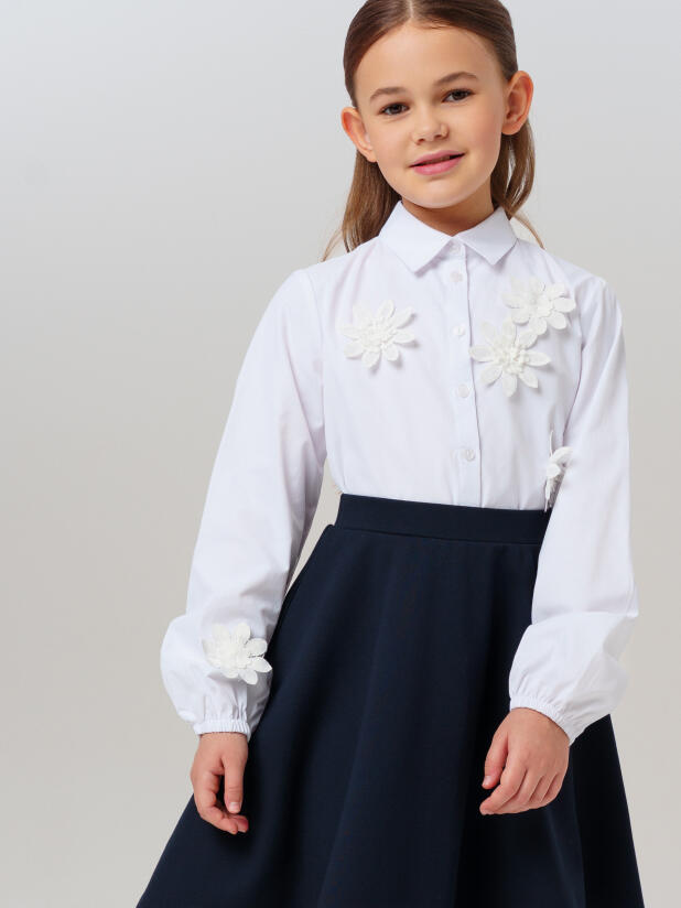 Классический крой с удобной посадкой обеспечивает свободу движений на уроках и переменах. Застёжка на пуговицах позволяет девочке легко надевать и снимать блузку самостоятельно, а нарядный декор делает образ праздничным, но остаётся достаточно сдержанным для школьного дресс-кода.